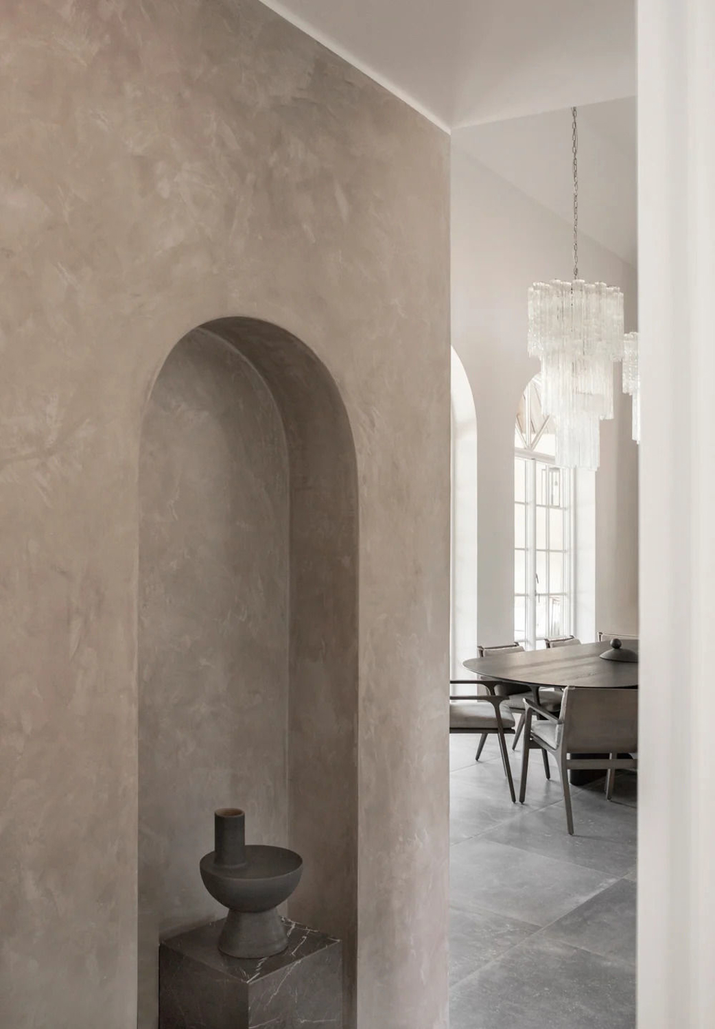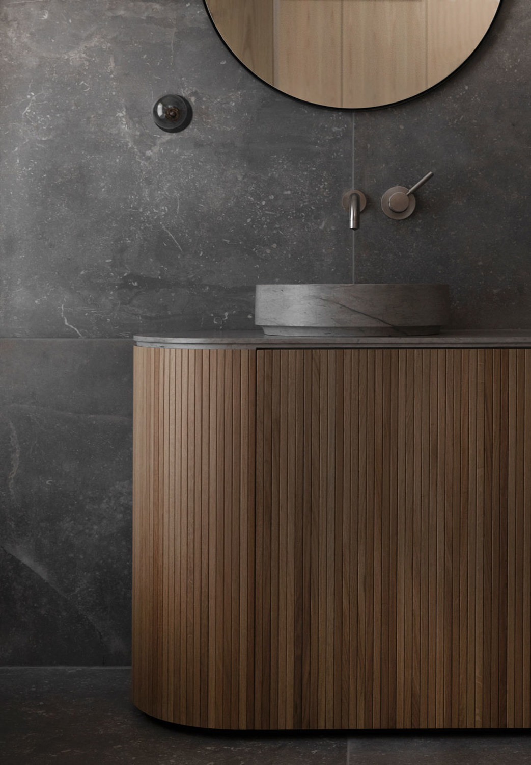 The floor and wall coverings of the whole building were created using tiles from the Carrière du Kronos stone-look collection, in the Anticata version and the Gent color.