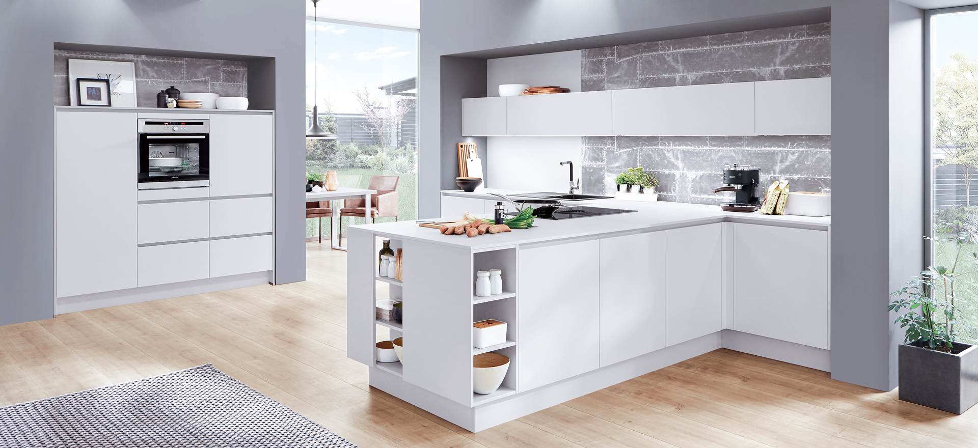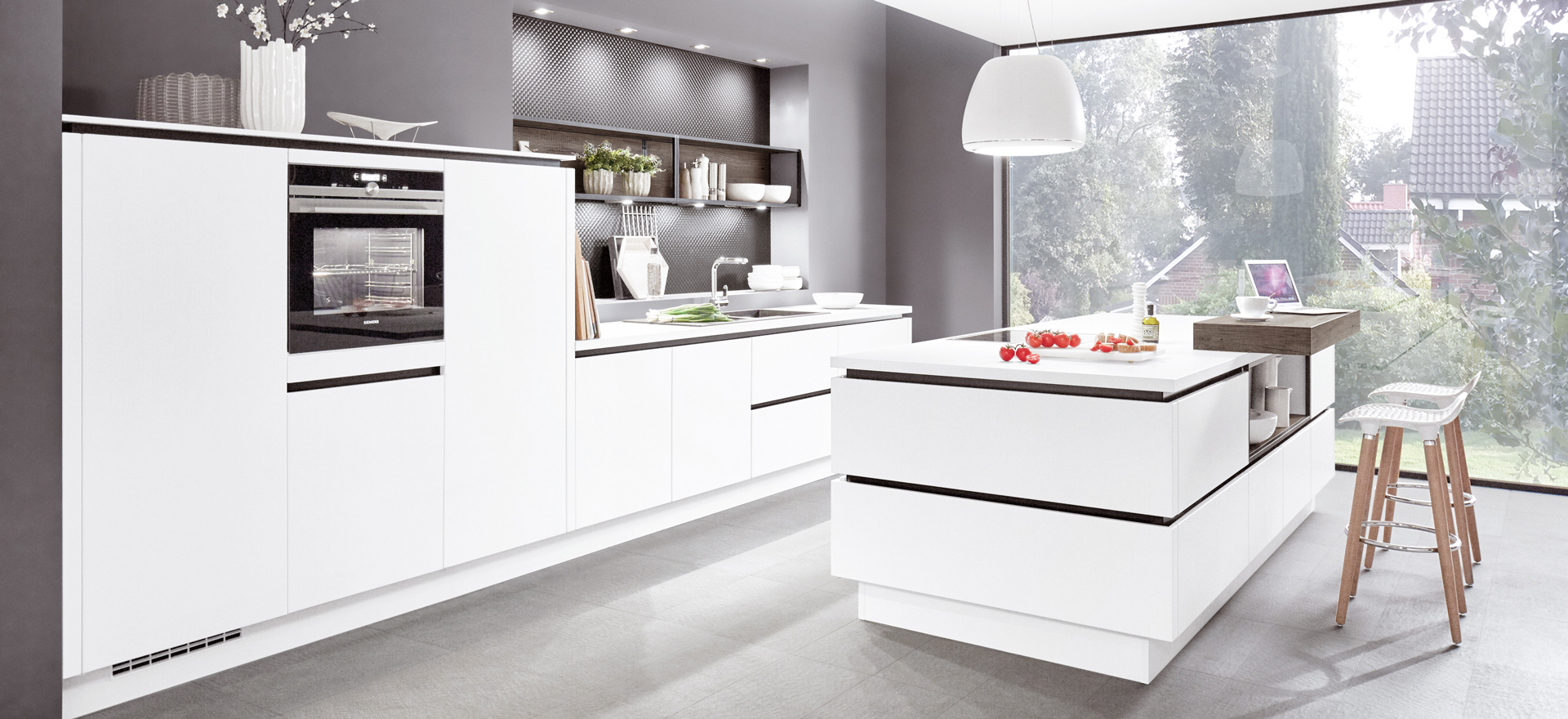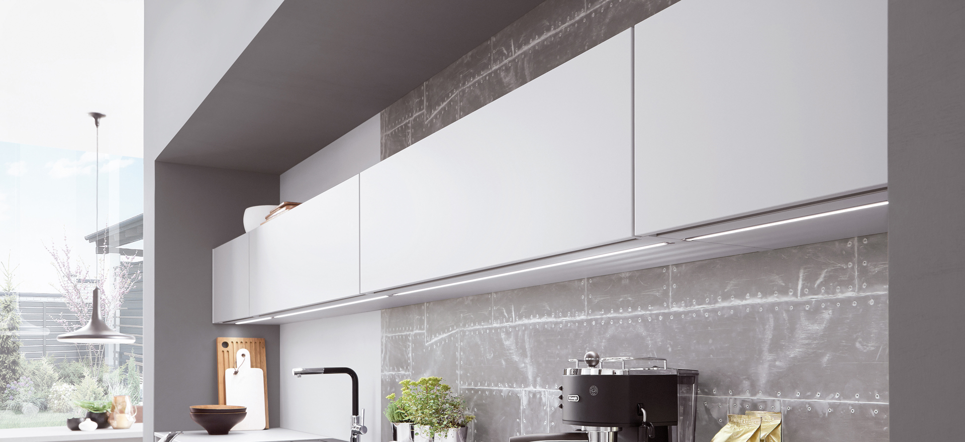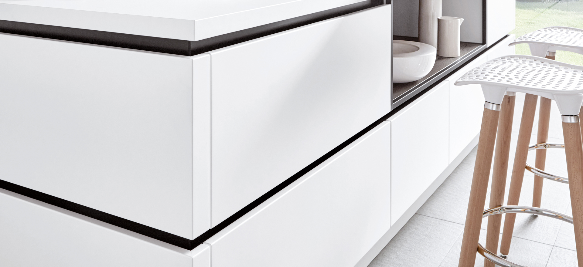 In conjunction with fronts in popular solid colors or wood decors, or matt or high gloss - the fine lines of this front design always express quintessential modernity and sleek elegance.