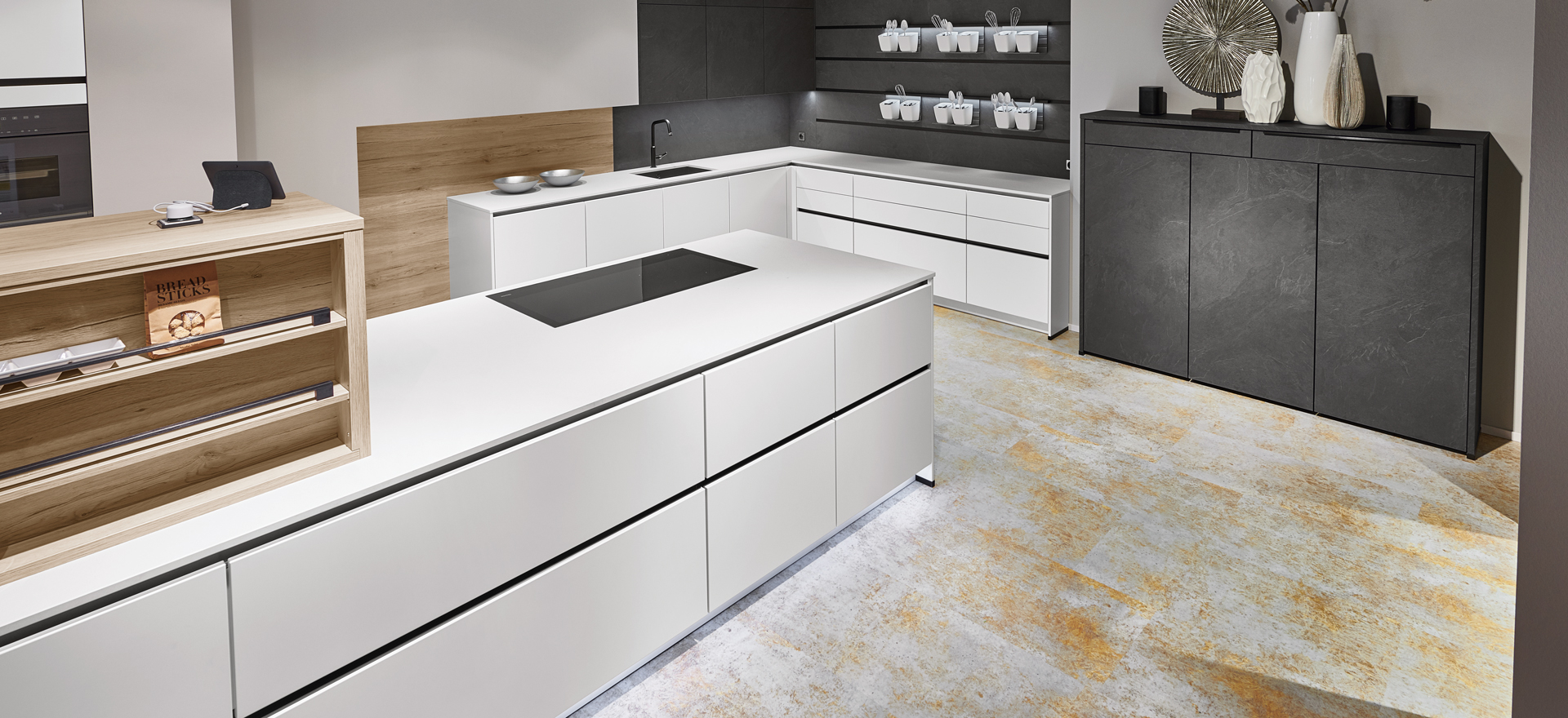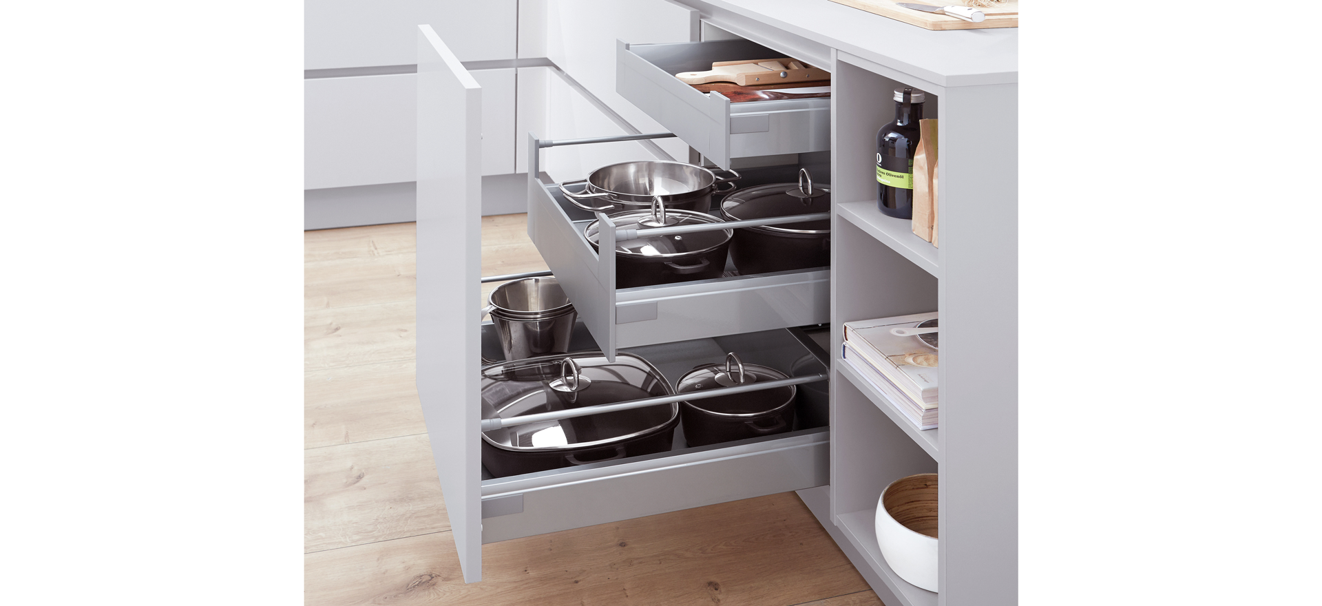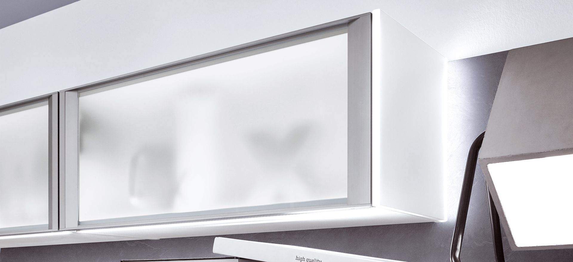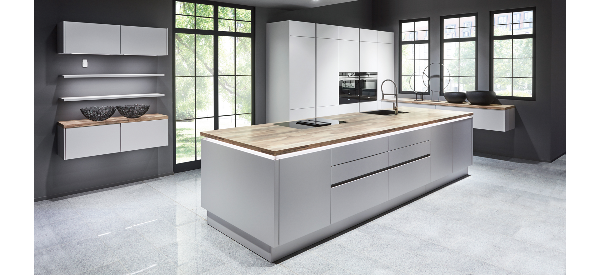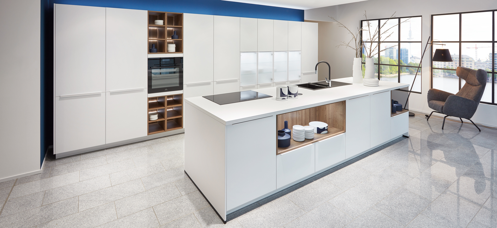 In conjunction with fronts in popular solid colors or wood decors, or matt or high gloss - the fine lines of this front design always express quintessential modernity and sleek elegance.