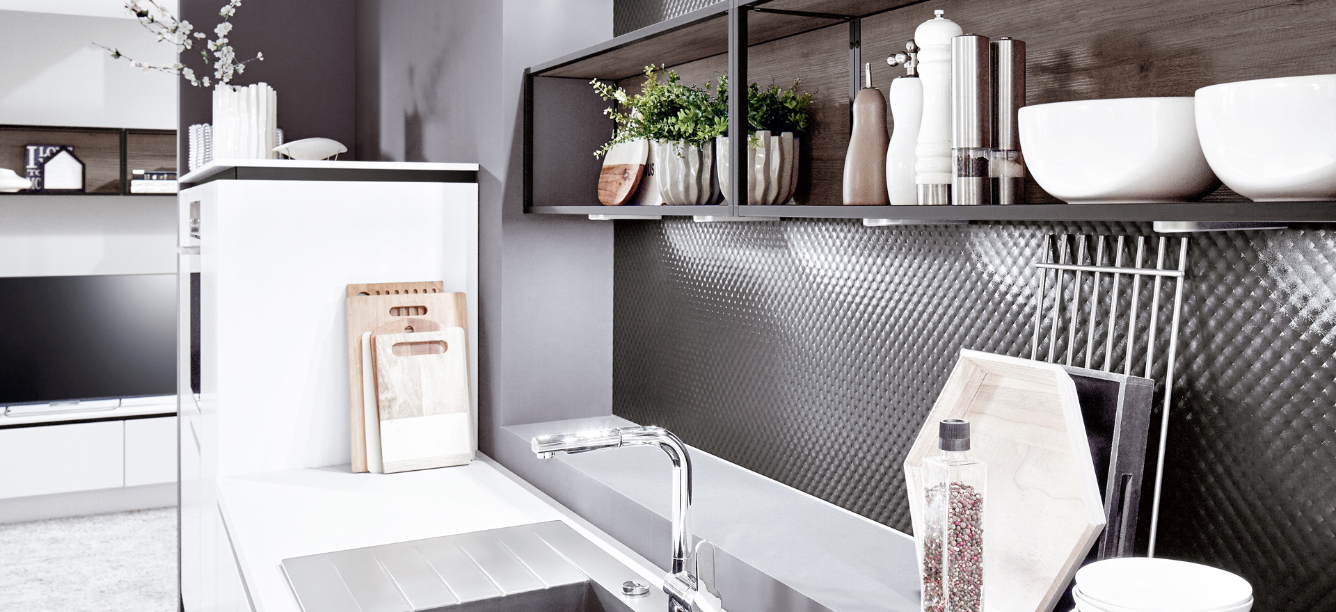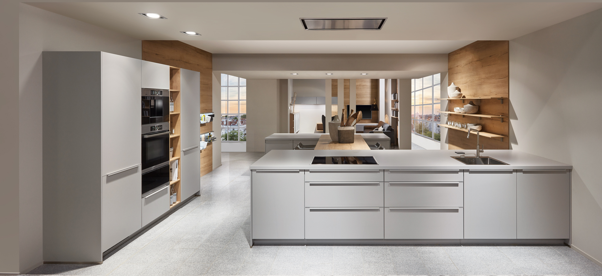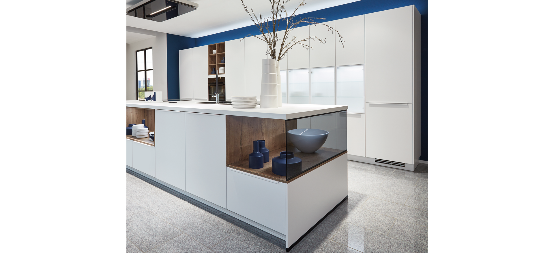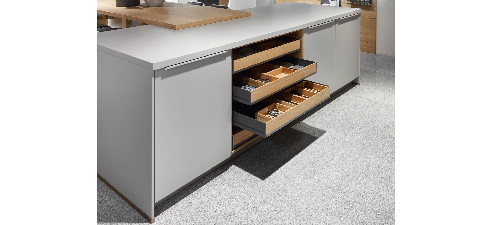 In conjunction with fronts in popular solid colors or wood decors, or matt or high gloss - the fine lines of this front design always express quintessential modernity and sleek elegance.