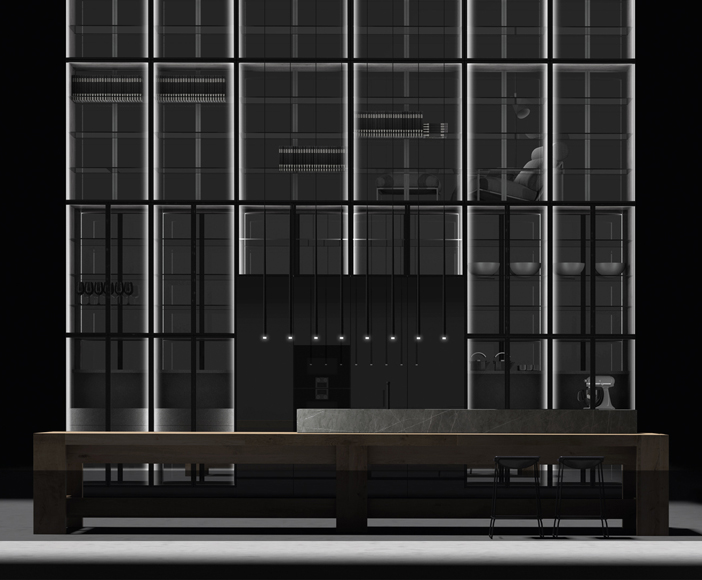 A monolithic block of stone rests on an oak table, being the central piece of the space. Sliding doors ensure that extra storage space and maximize the functionality where any element takes its own place.