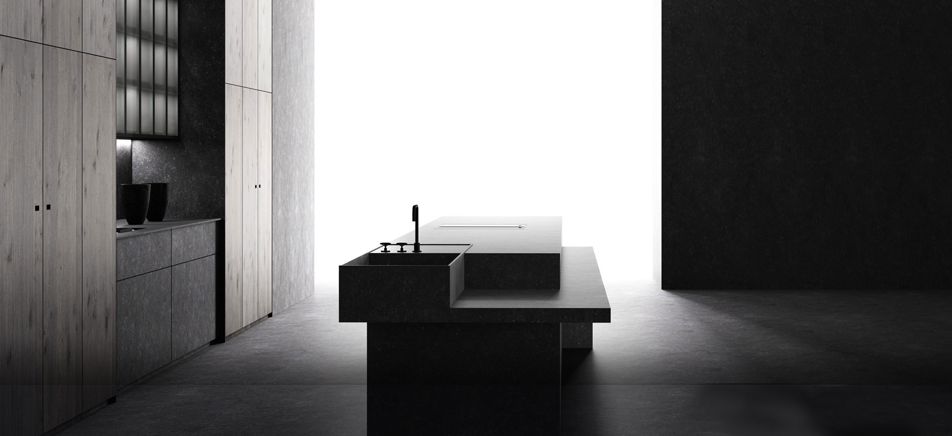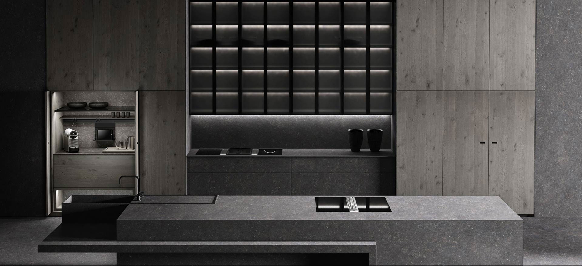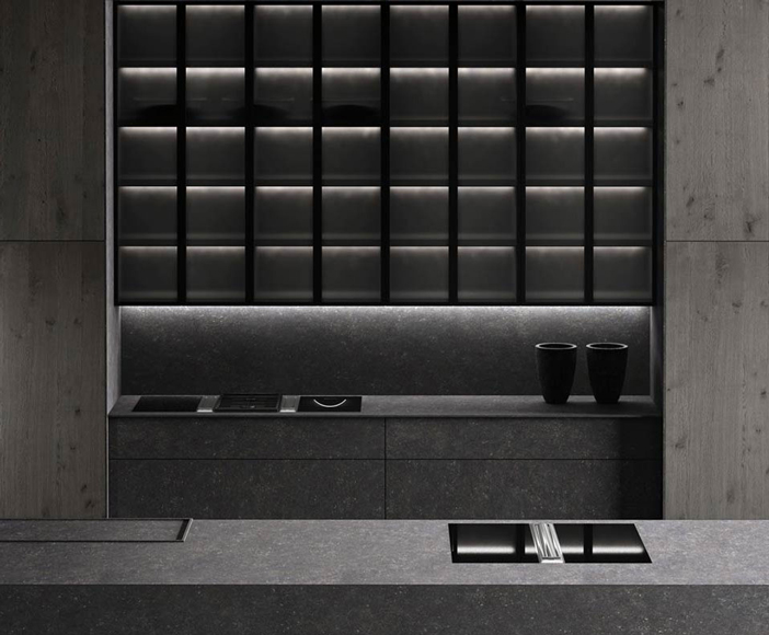 We have created this kitchen, that contains all the force of a rock in its central island, and the warmth of wood in its accompanying retractable columns. A kitchen as unique as the planet we live on.