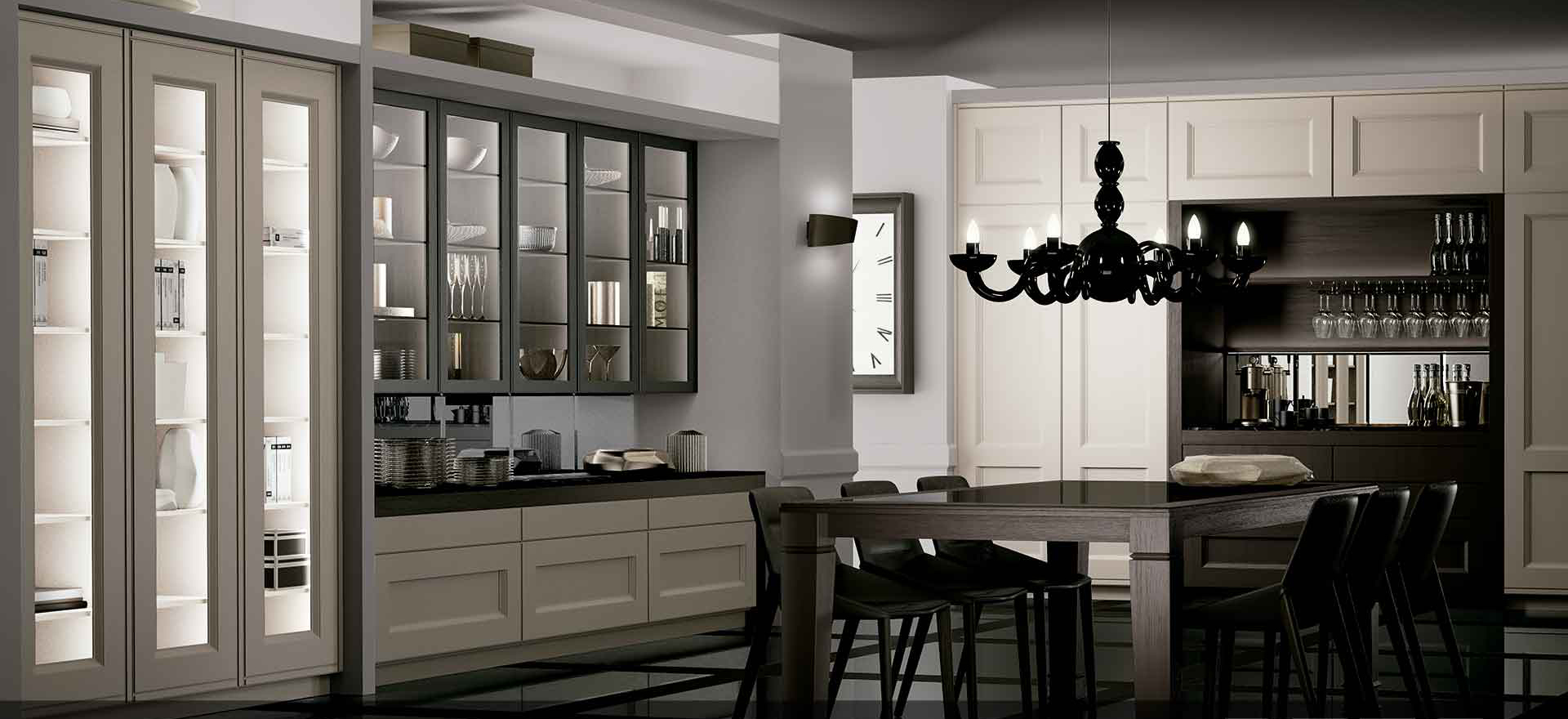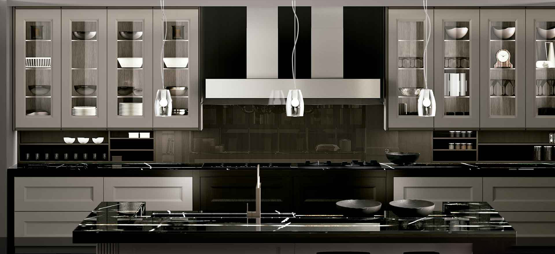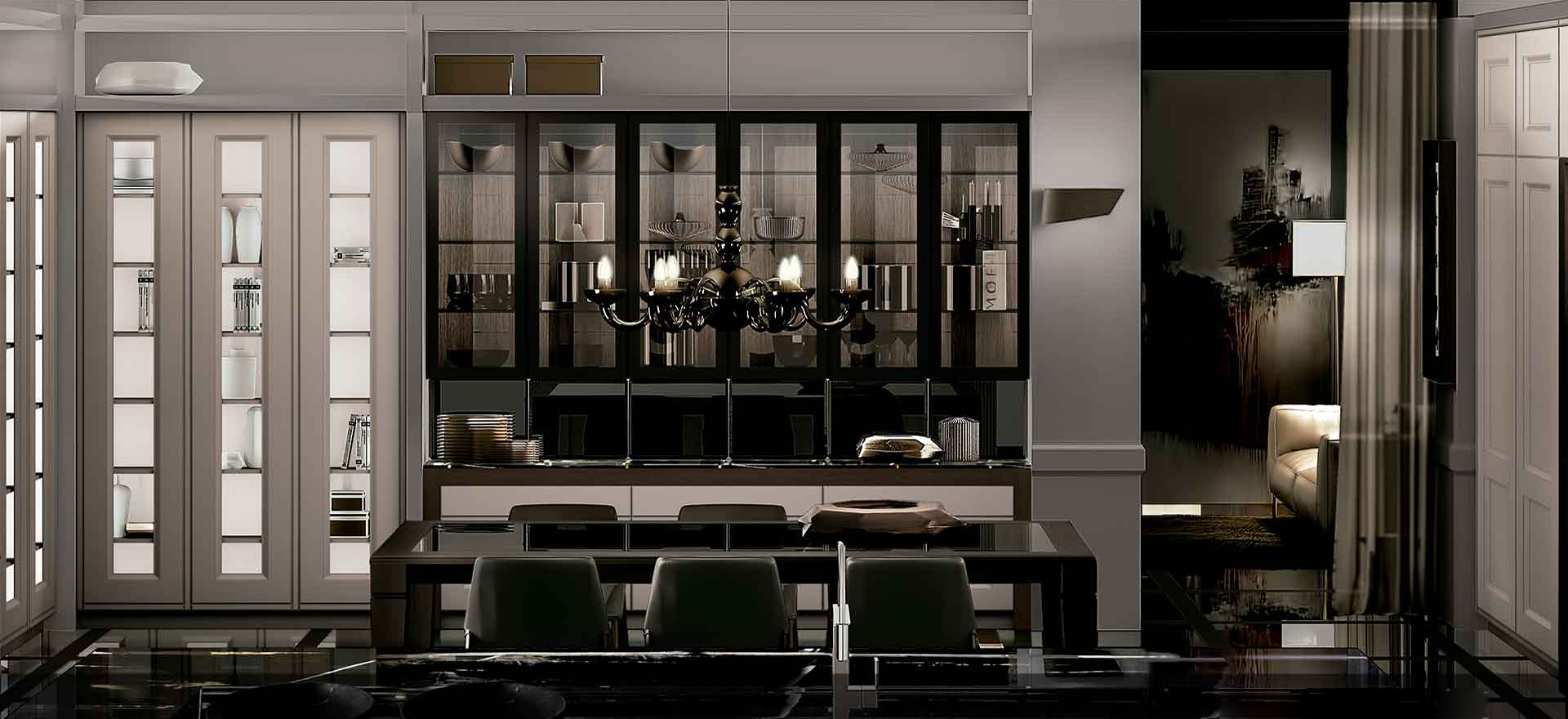 This outstanding kitchen combines display cabinet doors with a black aluminum frame and transparent glass focusing on design and the integration between spaces.