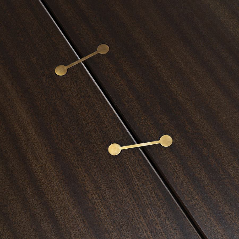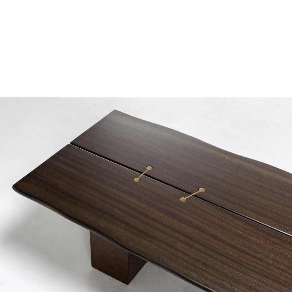 Two handmade solid wood planks are connected to each other by means of precious burnished brass connectors.