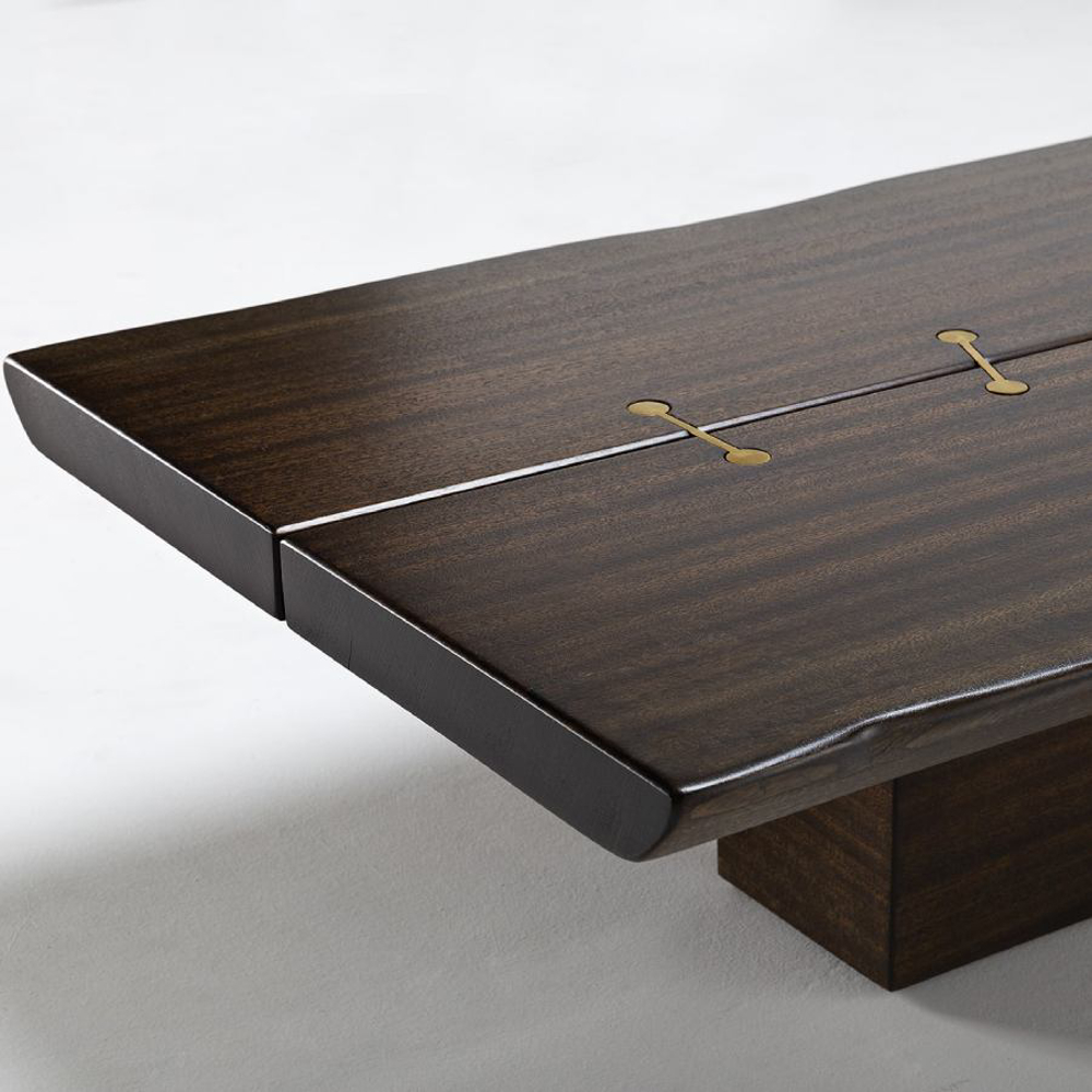 The natural grain of Sapelli mahogany and solid indigo wood stands out thanks to the rippled profile of the top. The imposing presence of the top is damped by the more delicate and symmetrical volumes of the support blocks below. For a coffee table that reinvents the ambience.