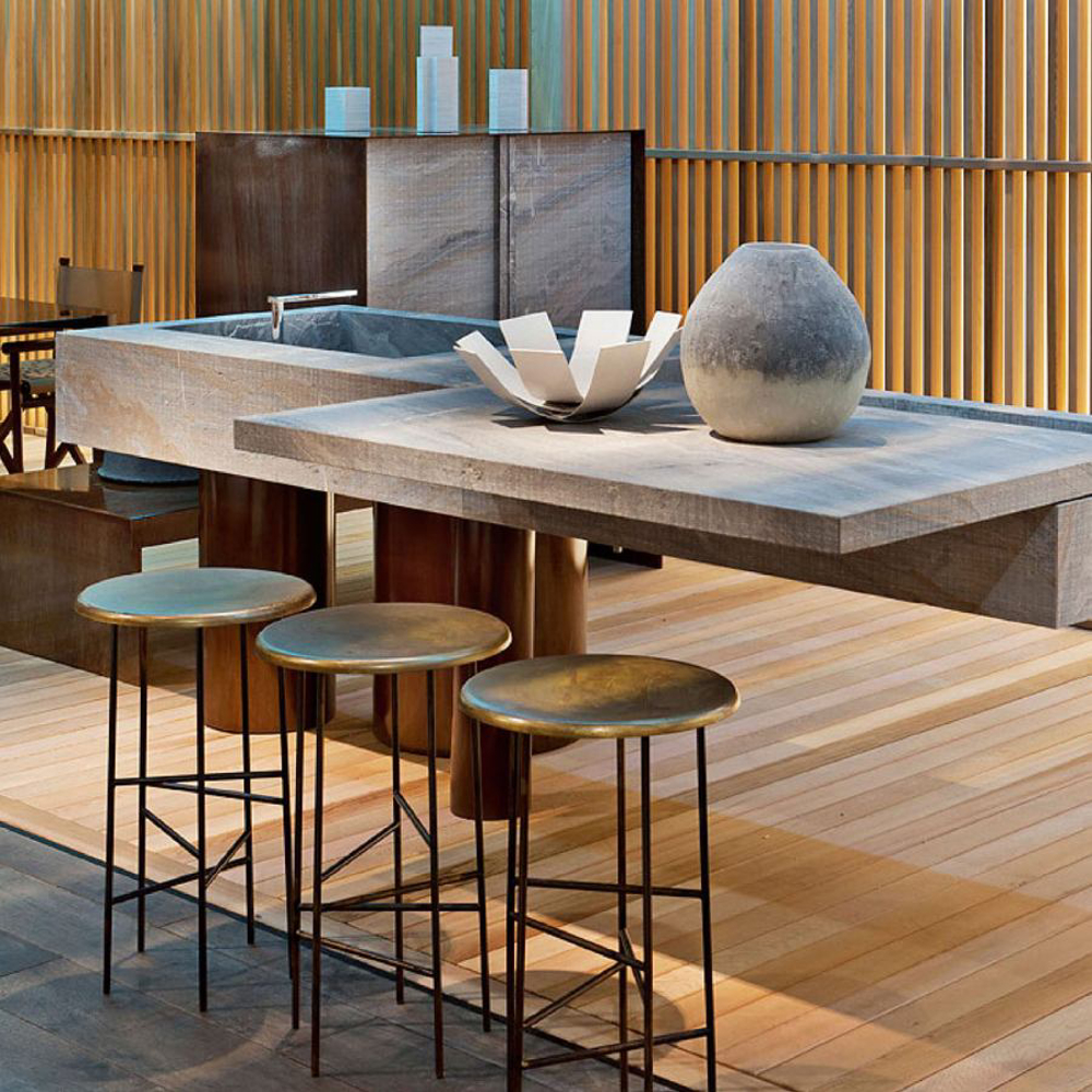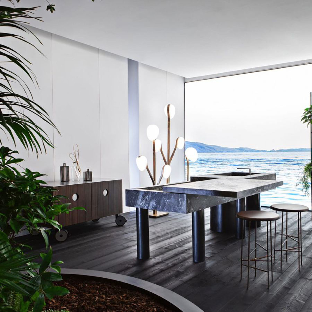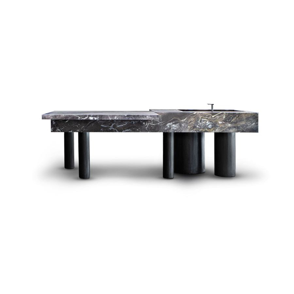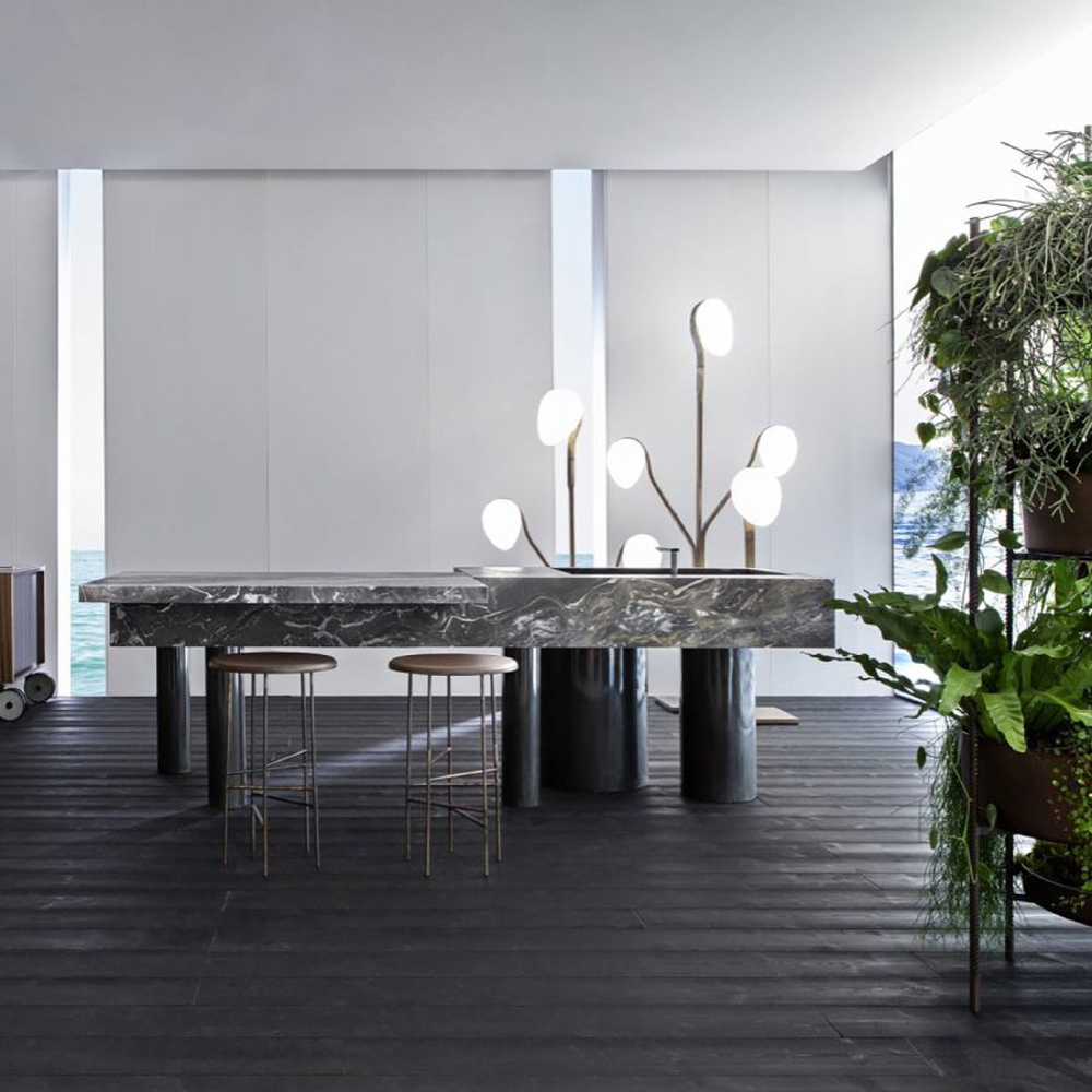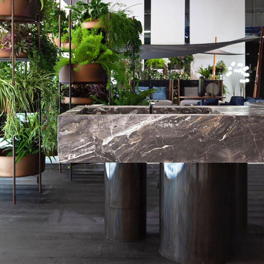 The legs, with different diameters and distributed asymmetrically, create a perfect balance of movement. Made of etched iron, they are available in rust and forest finishes. The streaks and reflections from acid etching make each element truly one of a kind thanks to Exteta craftsmen’s artistic handmade process. The legs have another important technical and aesthetic function of hiding the equipment passage from view.