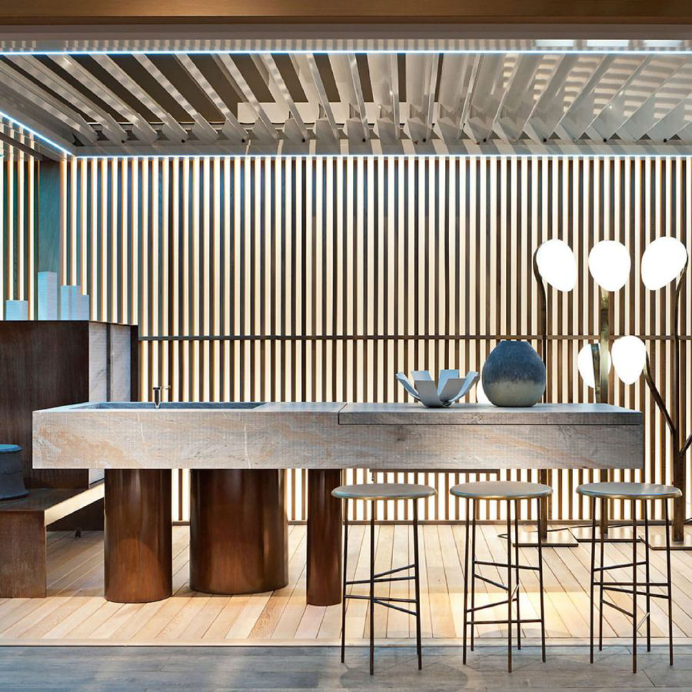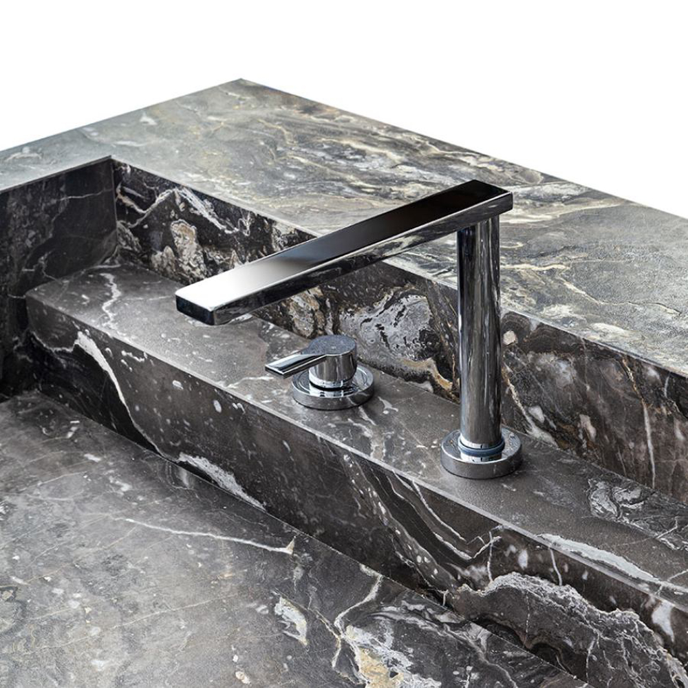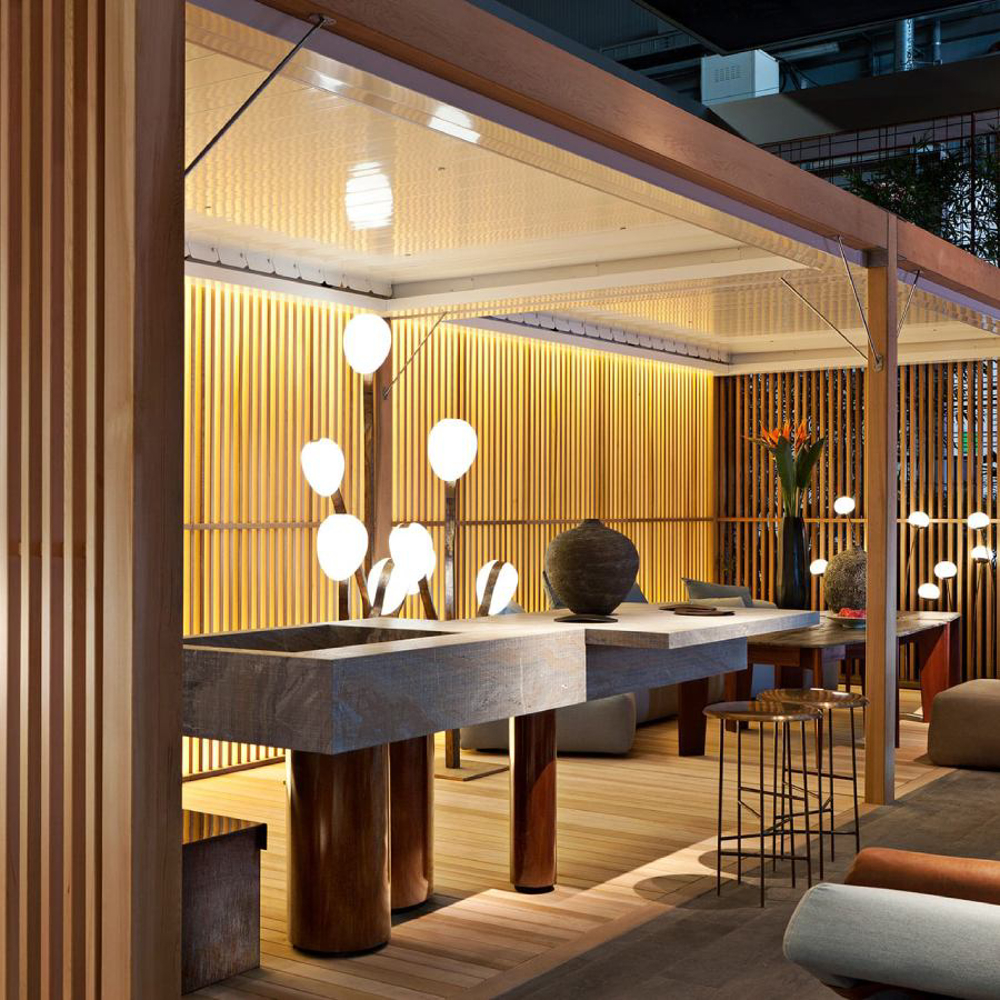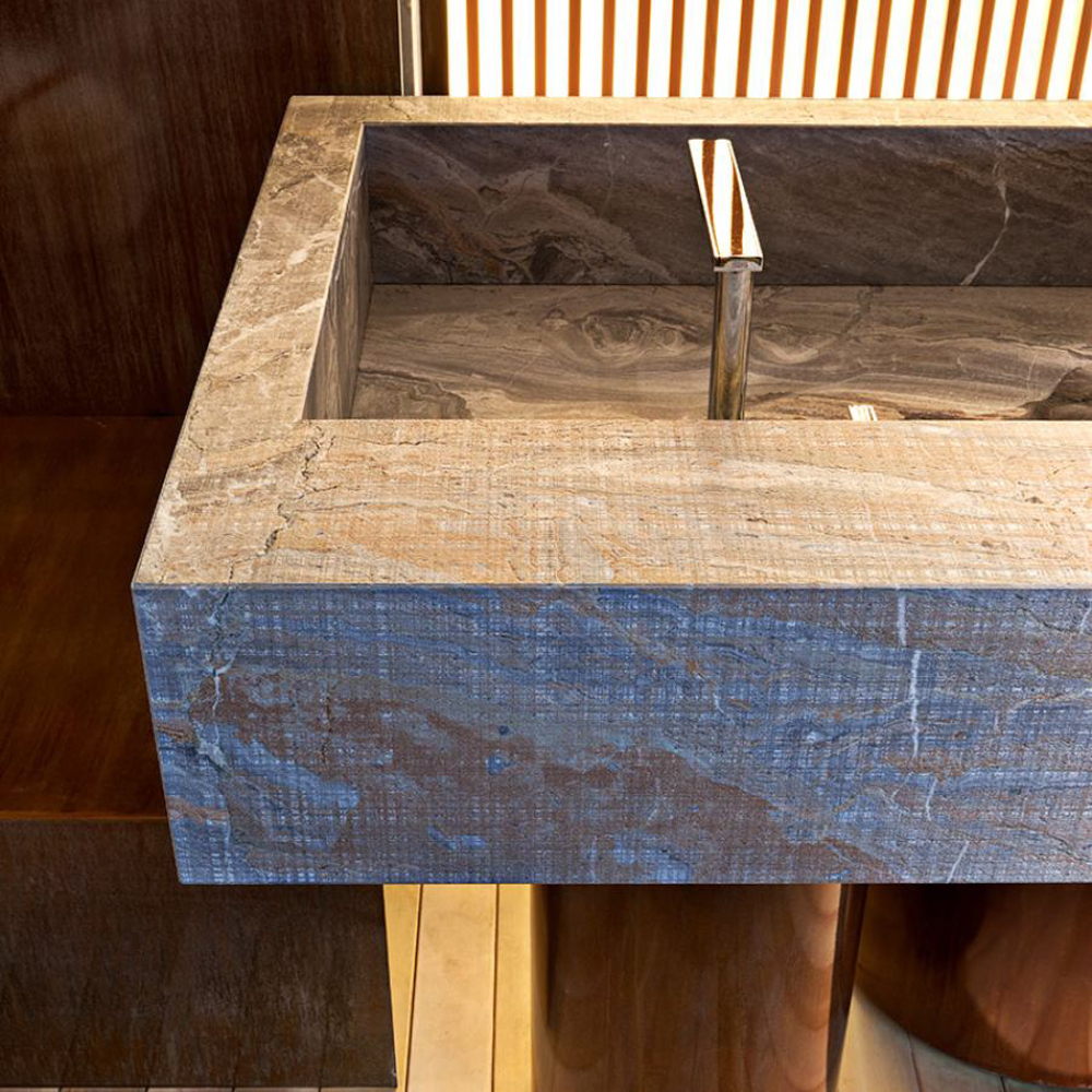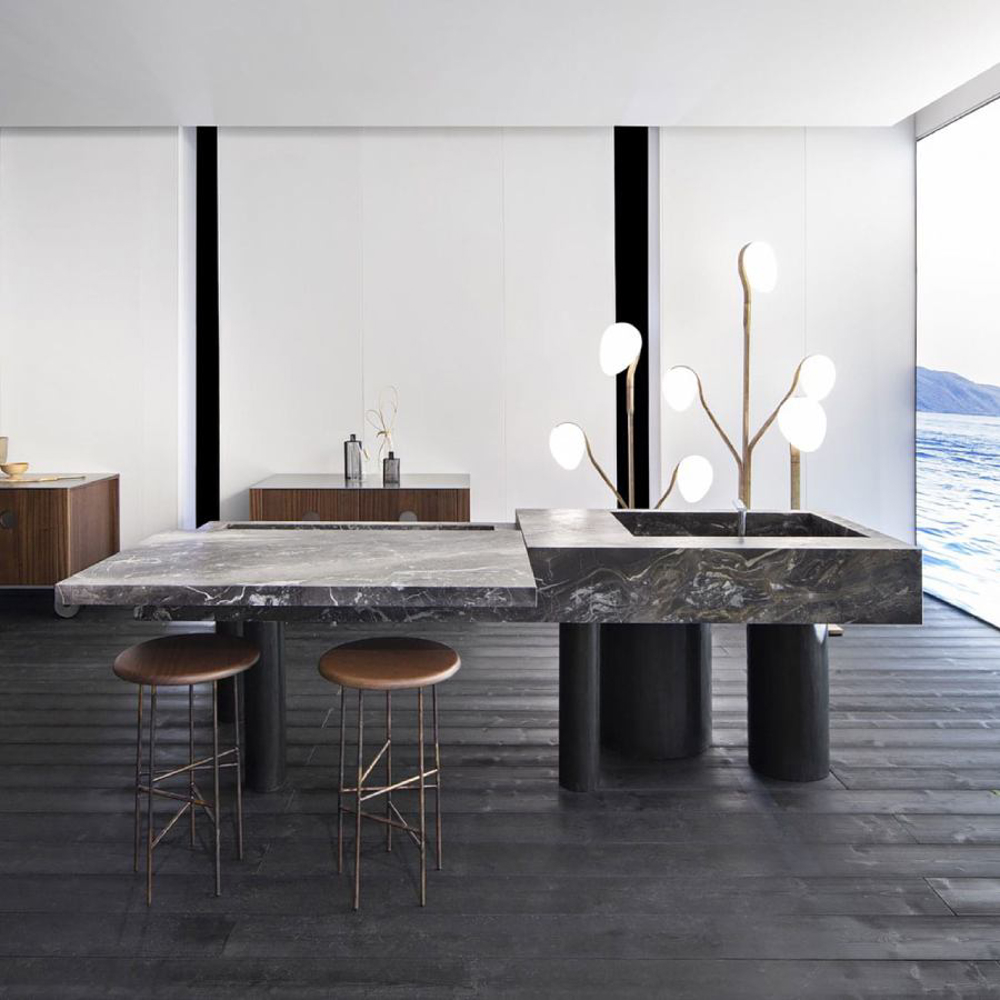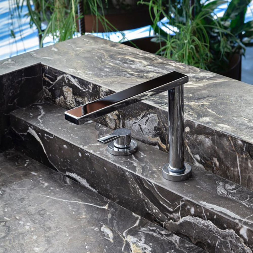 The legs, with different diameters and distributed asymmetrically, create a perfect balance of movement. Made of etched iron, they are available in rust and forest finishes. The streaks and reflections from acid etching make each element truly one of a kind thanks to Exteta craftsmen’s artistic handmade process. The legs have another important technical and aesthetic function of hiding the equipment passage from view.