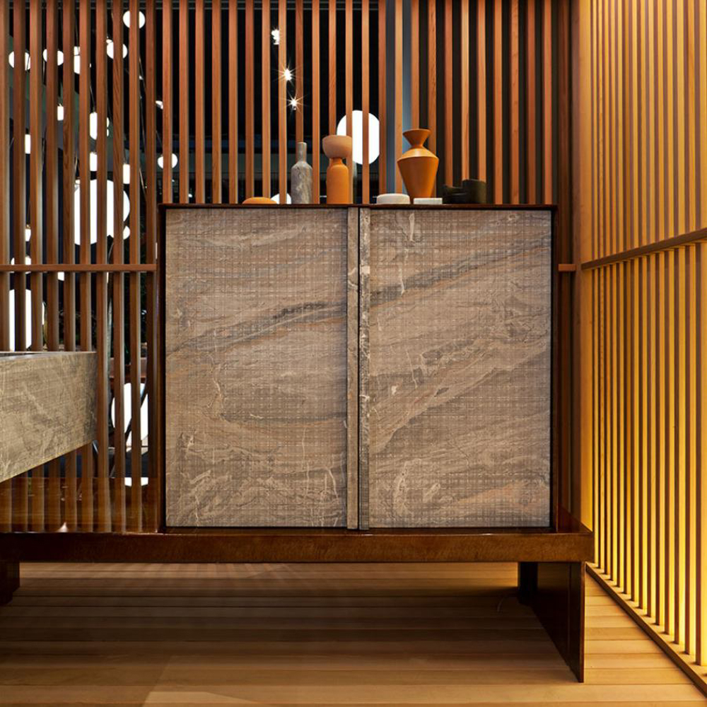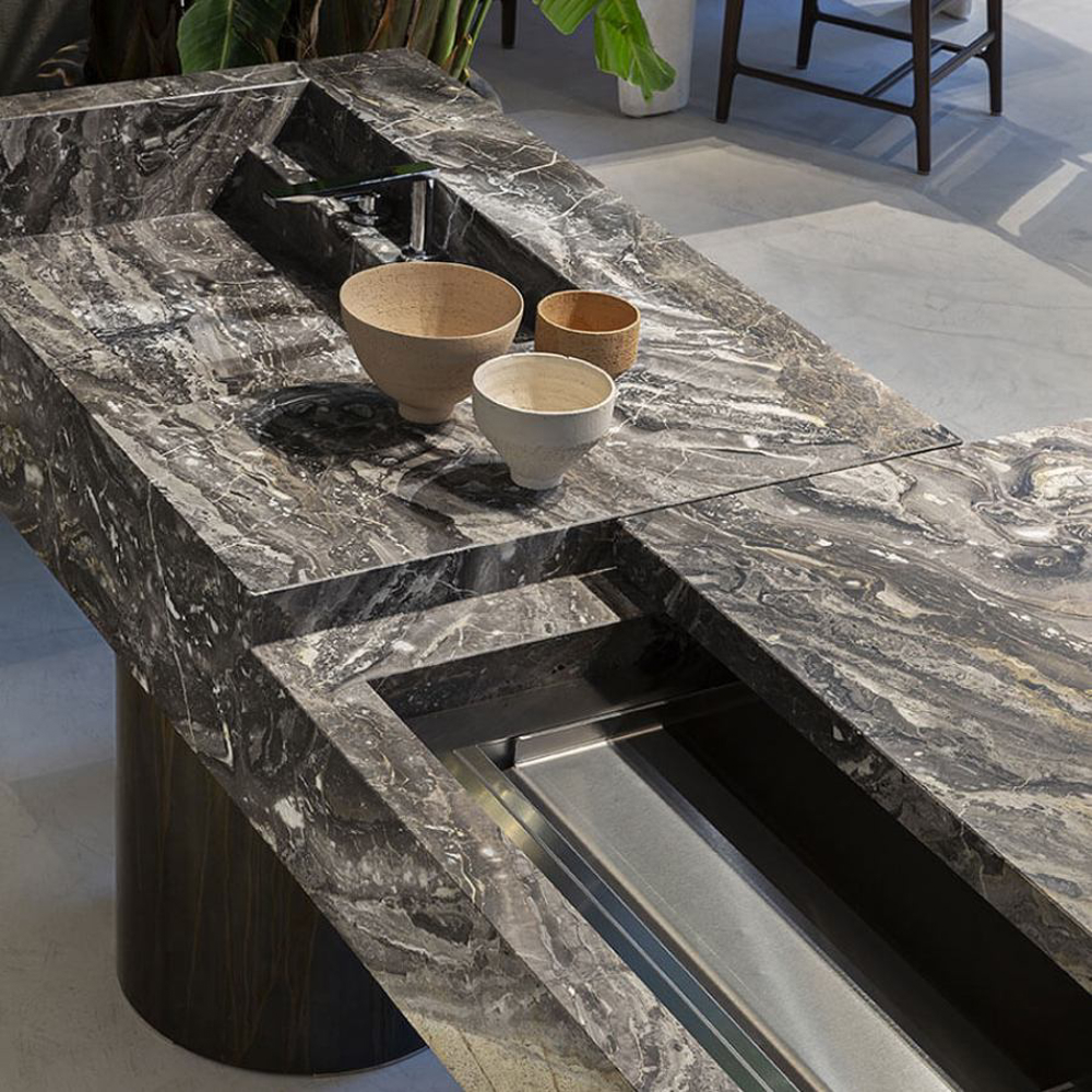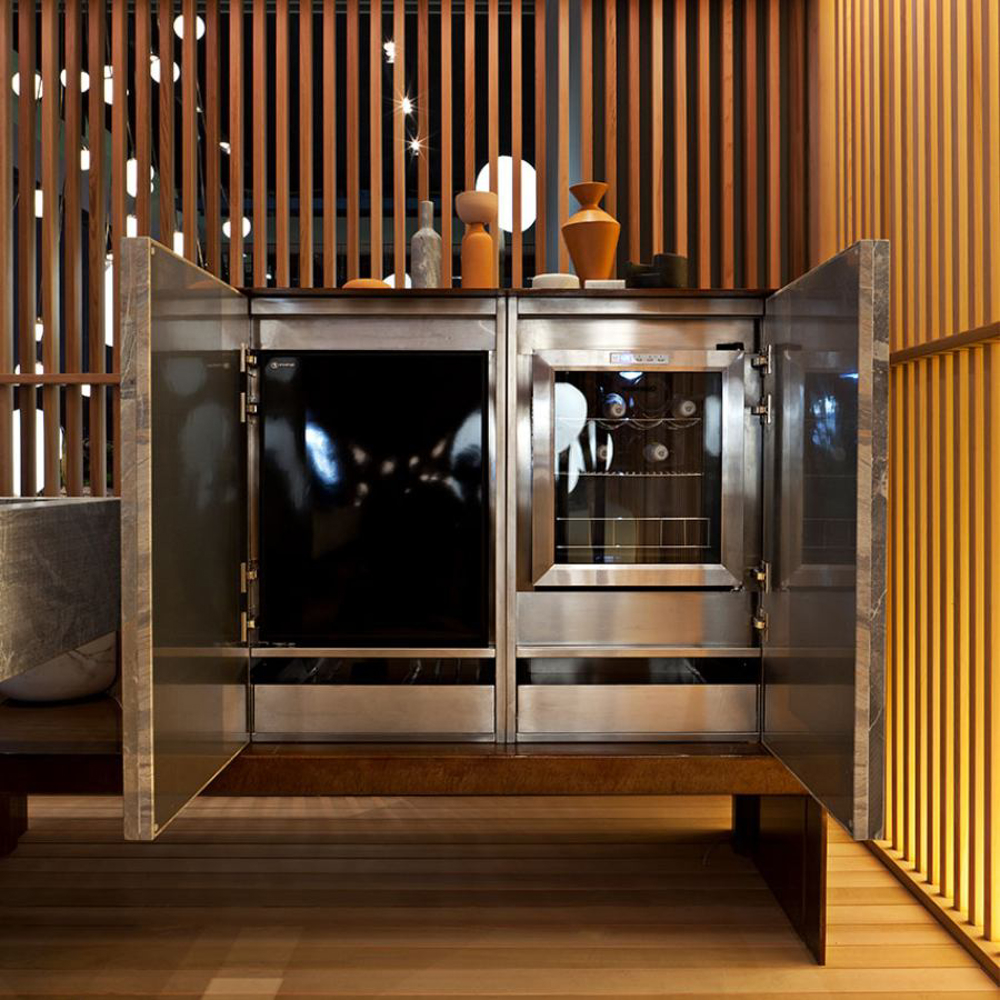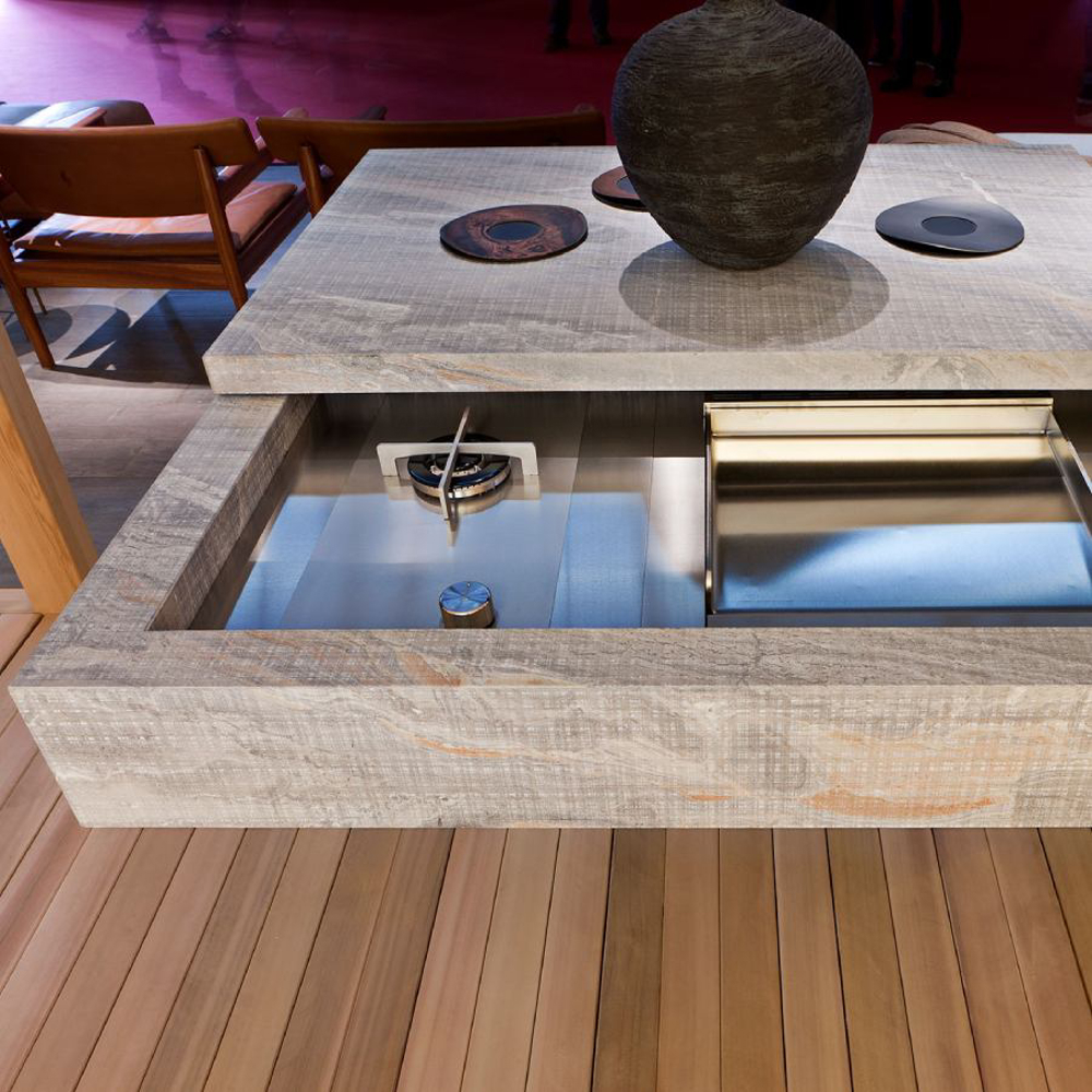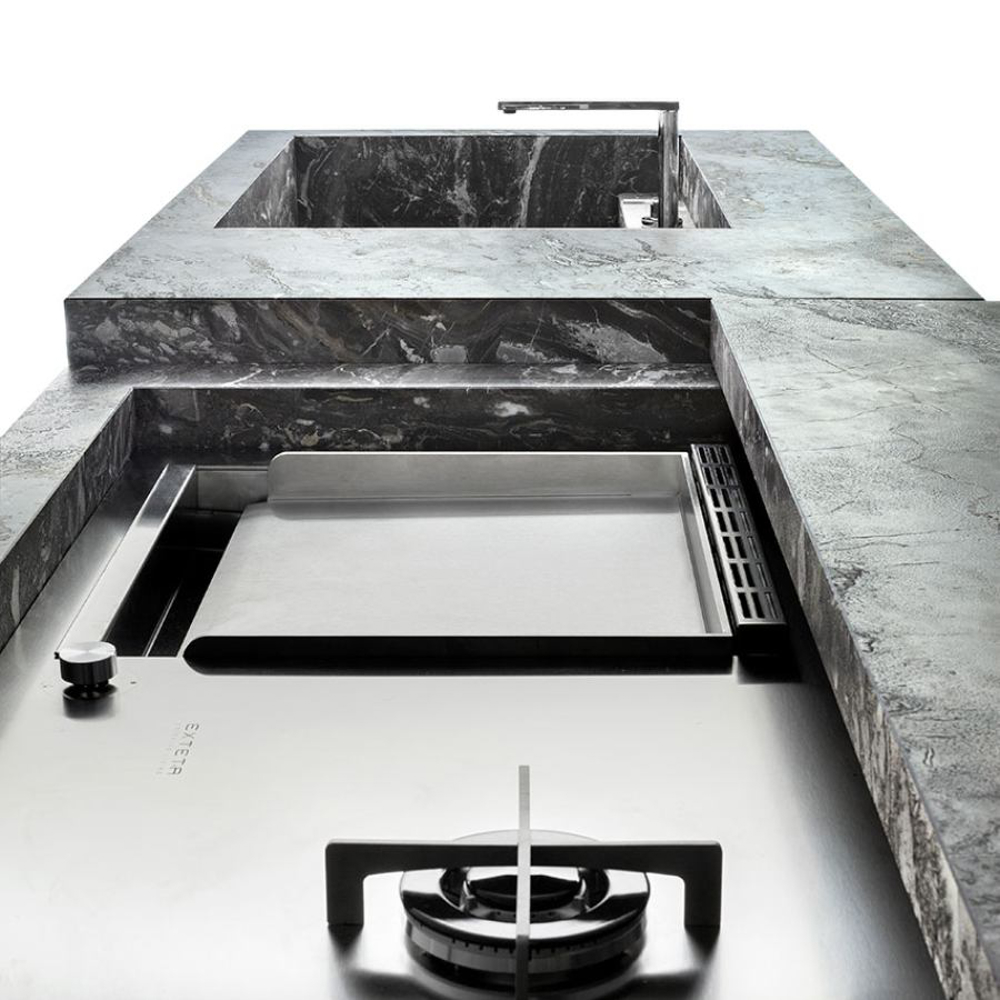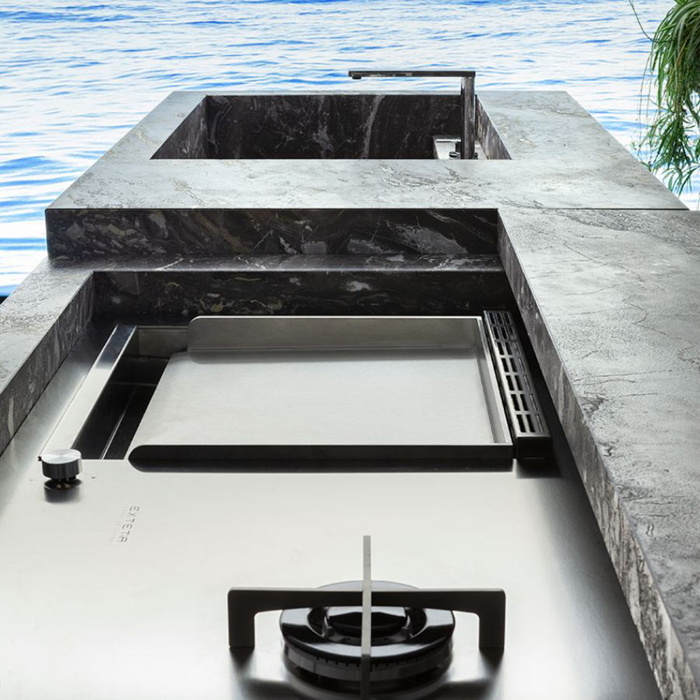 To fully enjoy the outdoors, exclusive accessories and Exteta cooking systems available for the 10th Kitchen are made in stainless steel. All appliances are discreetly integrated and, when not used, disappear from view by closing the sliding top.