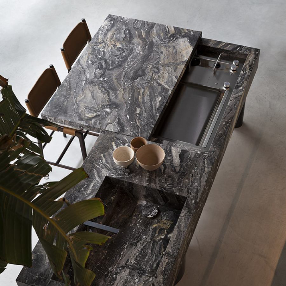 The accessories and cooking systems to be inserted in the kitchen are covered by a sliding top that protects them from weathering. The top, when opened, becomes an elegant table that completes the 10th Kitchen features.