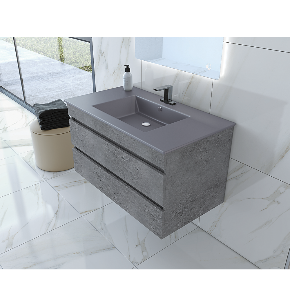 This contemporary and stylish Legnori bathroom vanity gracefully showcases a current silhouette combined with a minimalist, eye-pleasing design. It gives your bathroom a relaxed and peaceful look. Still looking slim and reserved, when we talk storage, its two soft-closing drawers offer ample space for toiletries, towels, and other bathroom accessories. The vanity comes with a high-end quality engineered stone countertop that seamlessly flows into a perfect matt grey drop-in sink.Â