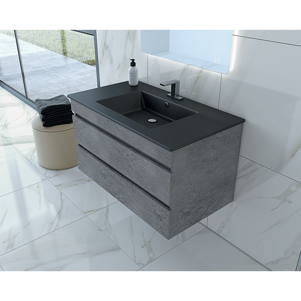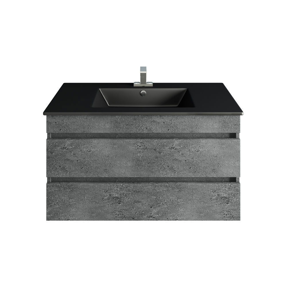 This slim and stylish Legnori bathroom vanity elegantly showcases a current silhouette interlinked with a minimalist, eye-catching design. It gives your bathroom a calm and relaxed look. Still looking reserved and sleek, when it comes to storage, its two soft-closing drawers provide surprisingly ample space for toiletries, towels, and other bathroom accessories. The vanity comes with a superior quality engineered stone countertop that seamlessly flows into a perfect matt black drop-in sink.Â
