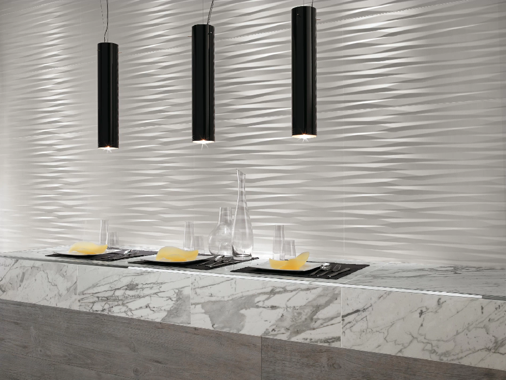 Three-dimensional ceramic surfaces where the sculpted play of light and shadows meets the highest quality Atlas Concorde white clay tiles. A range of relief surfaces creates spectacular walls with elegant facets and design textures that decorate any type of interior with simplicity and sophistication.