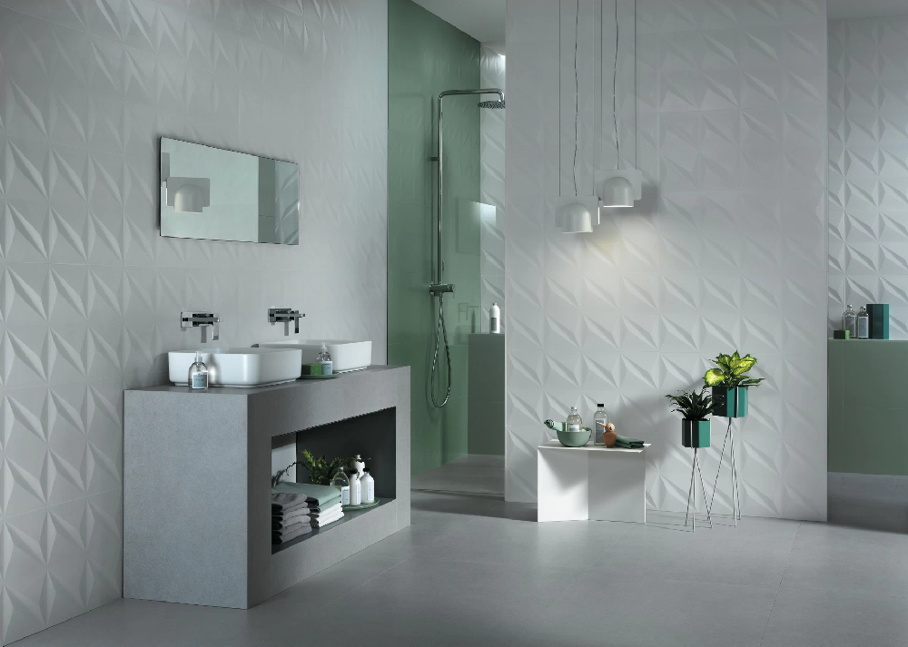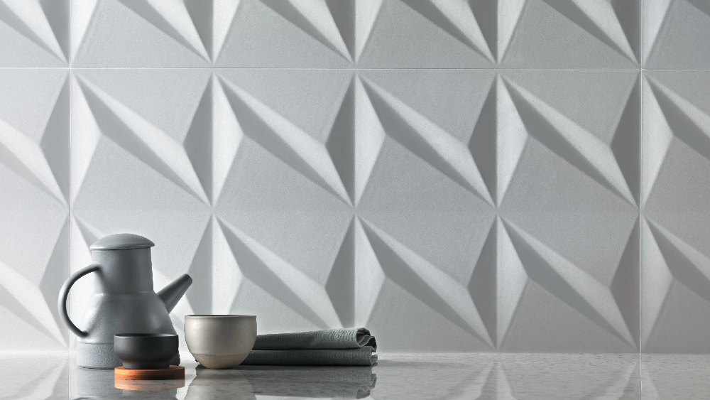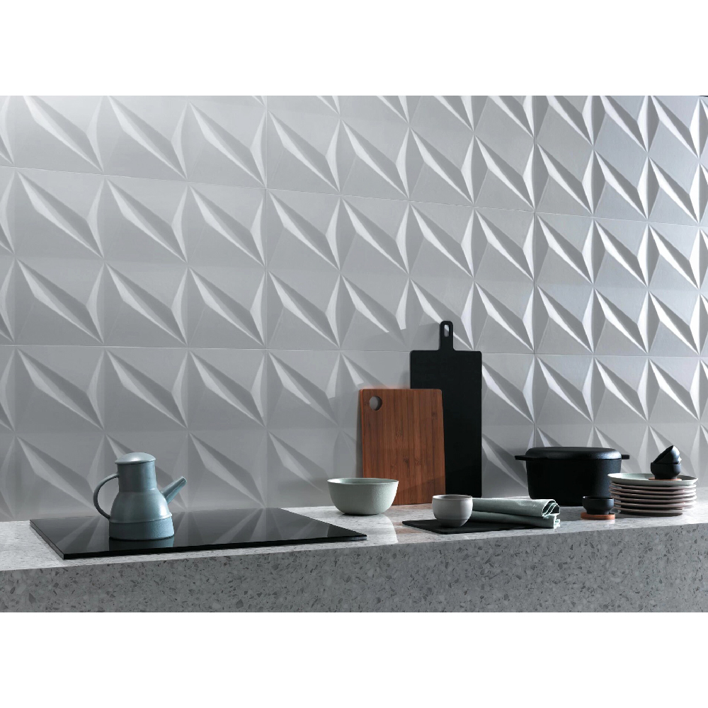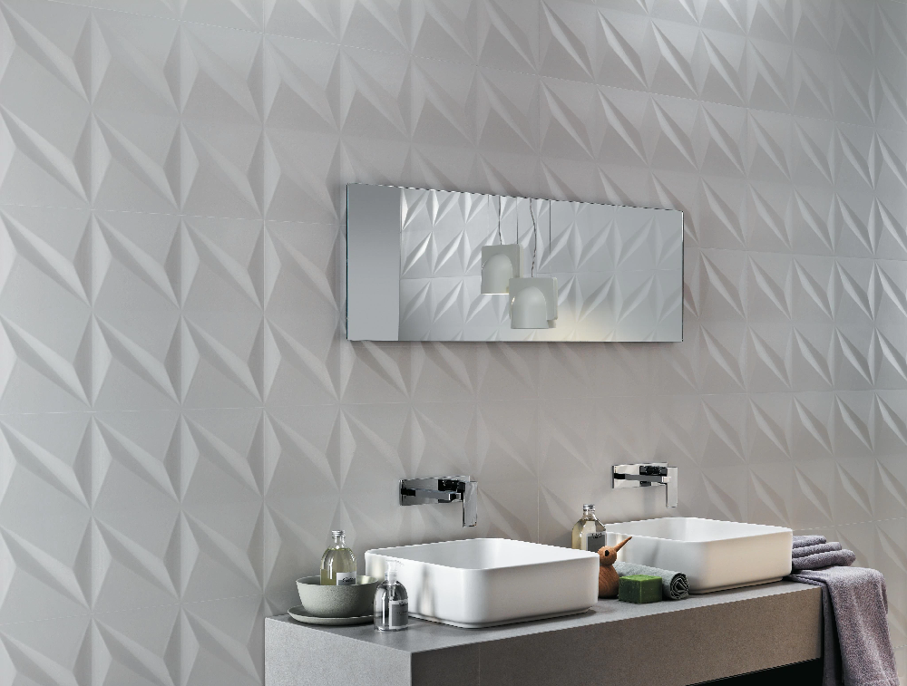 Three-dimensional ceramic surfaces where the sculpted play of light and shadows meets the highest quality Atlas Concorde white clay tiles. A range of relief surfaces creates spectacular walls with elegant facets and design textures that decorate any type of interior with simplicity and sophistication.Â