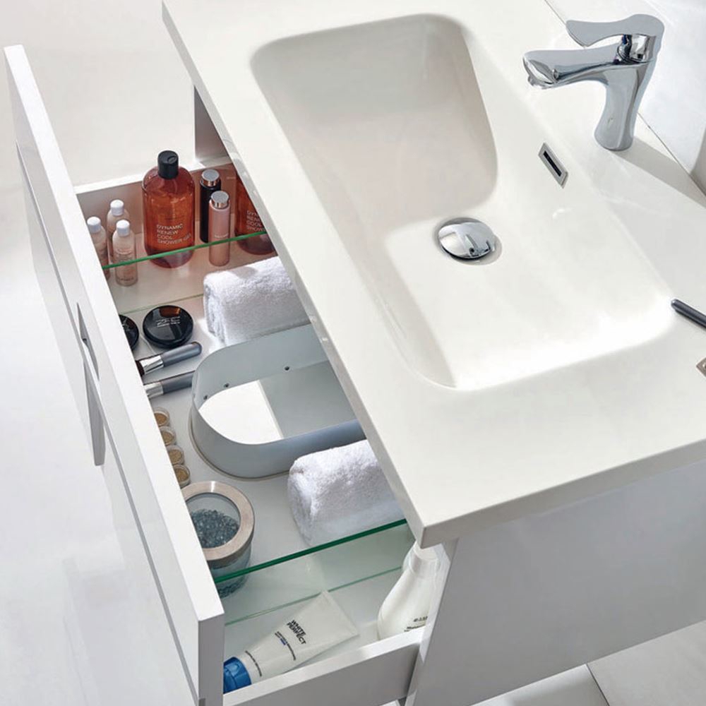 This contemporary single Mino Glossy White bathroom vanity is designed for people, who seek more than a modern and clear design. Perfect shaped corners, integrated handle and a specific rectangular shape woodcut in the middle accentuate the aesthetic style of this vanity.