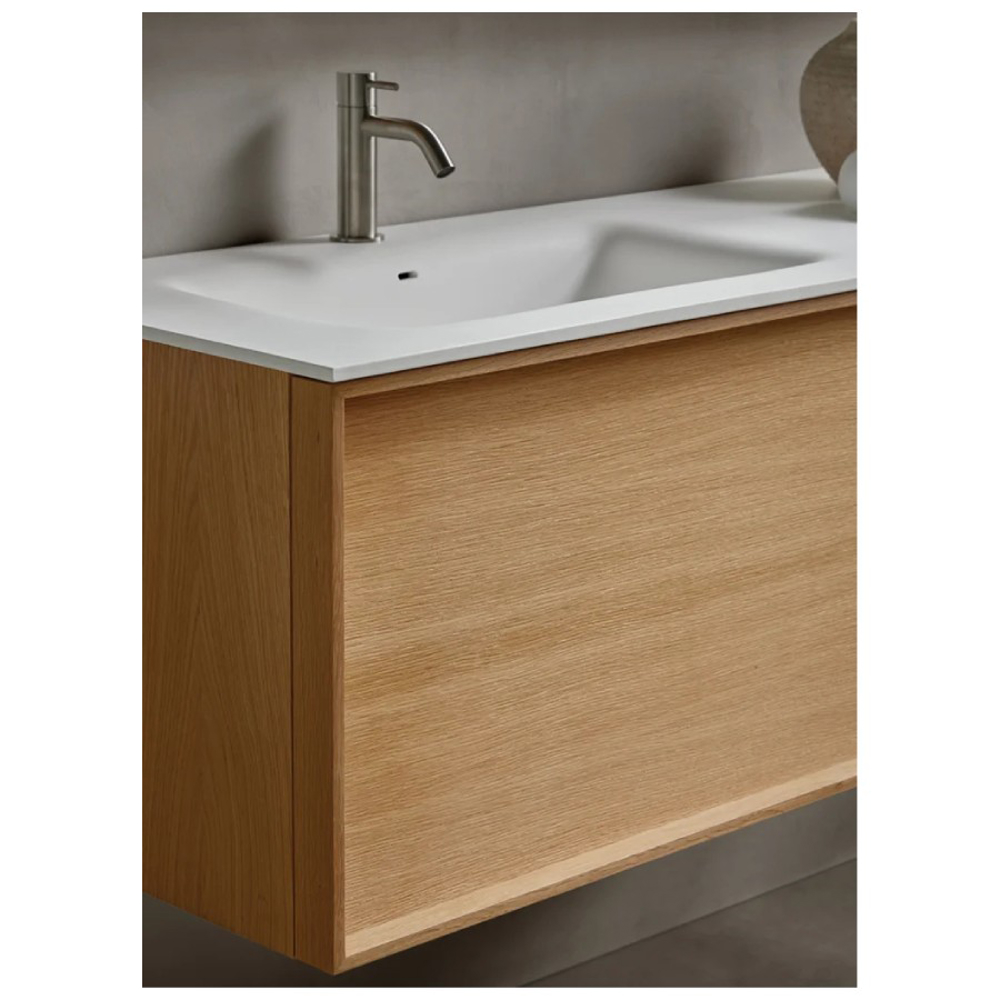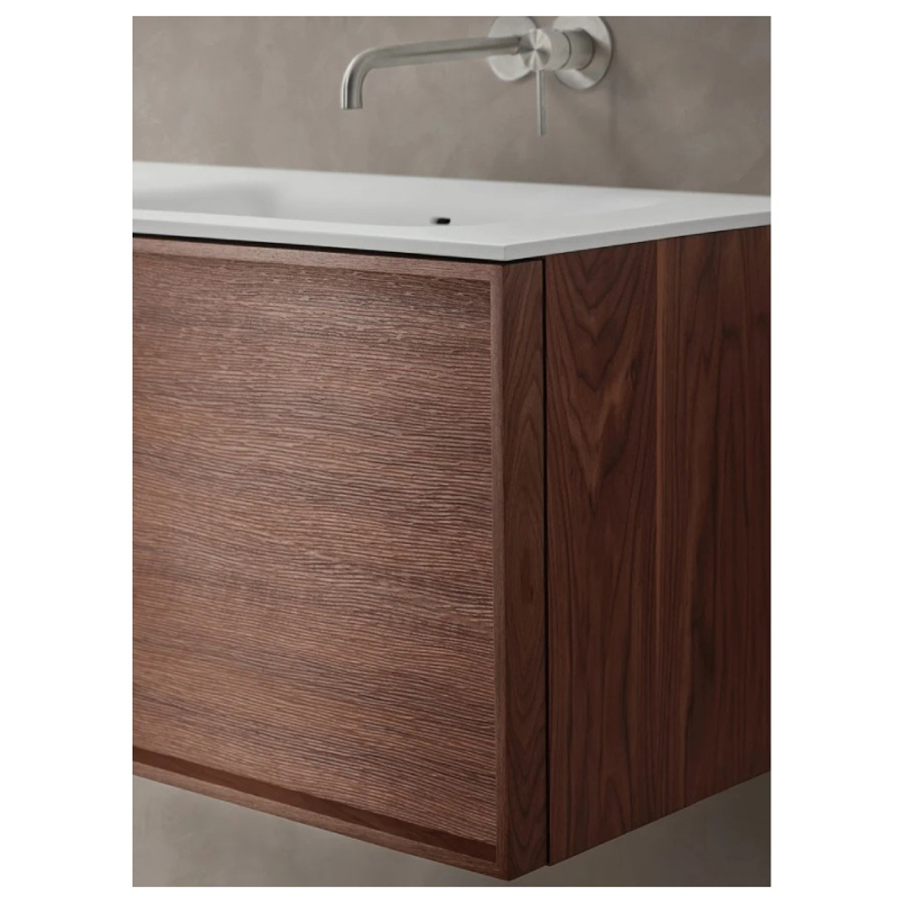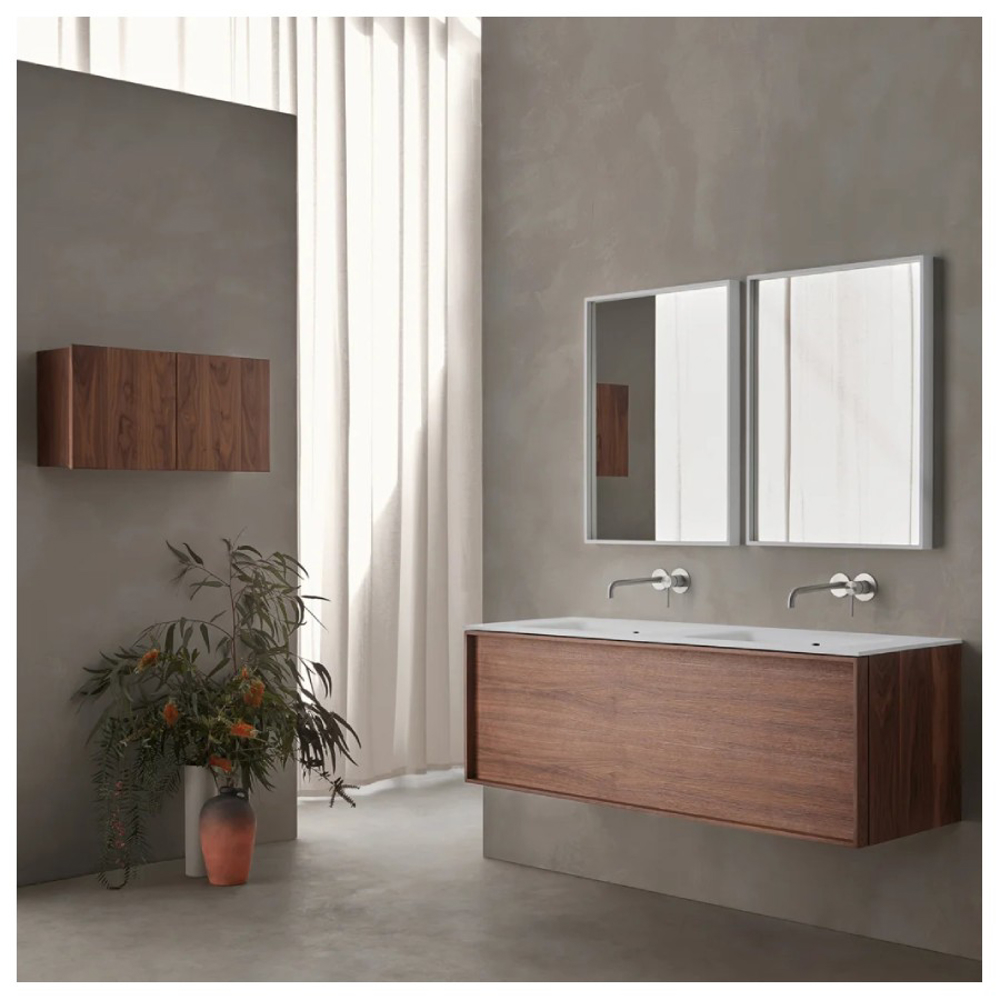 The Robbia bathroom cabinet is made of solid wood. This vanity unit is available in Walnut wood or American Oak wood. Natural wood veneer finishes are applied to the drawer front of the Robbia bathroom cabinet. Accompanied by the mirror from the same range, this vanity unit is suitable for a designer style bathroom.