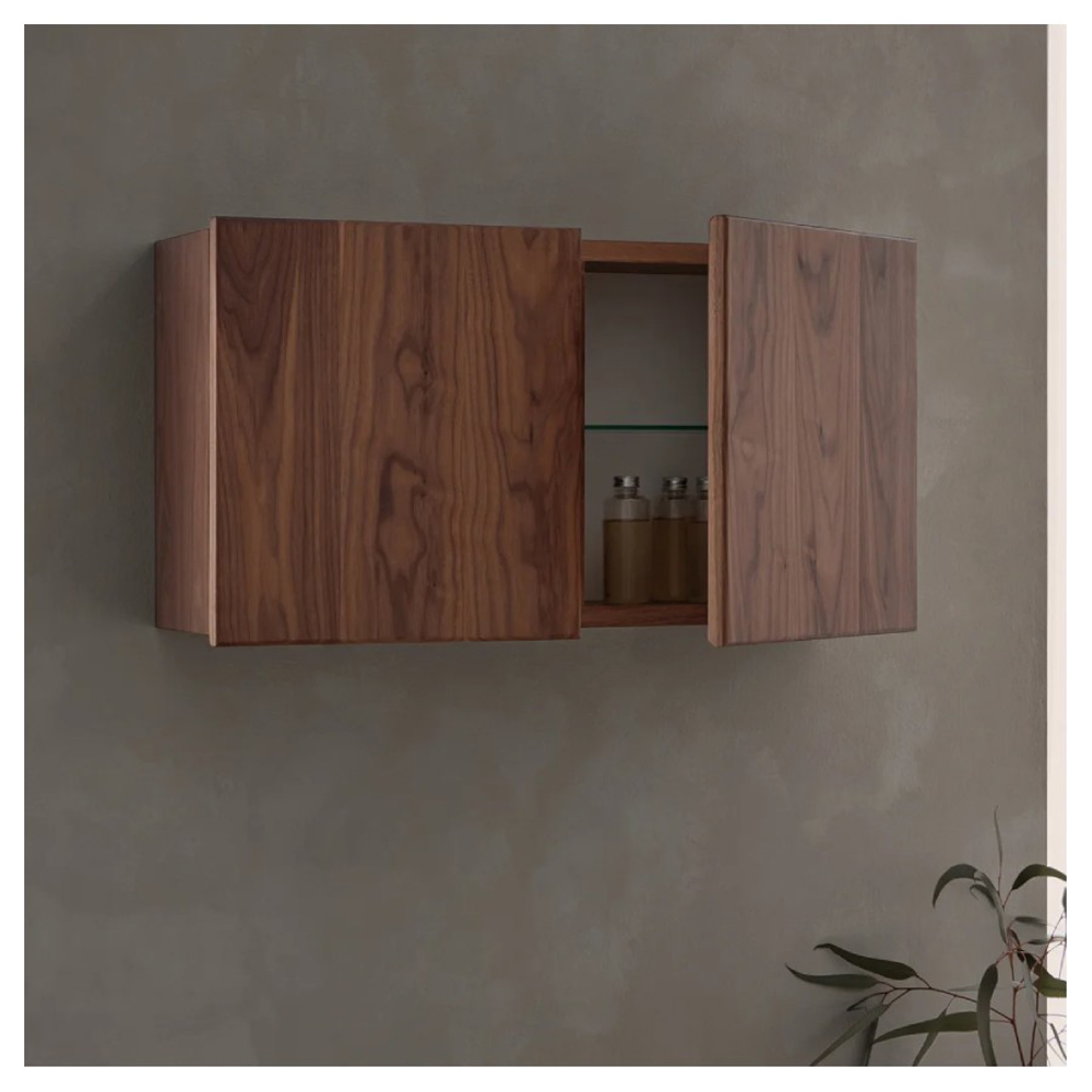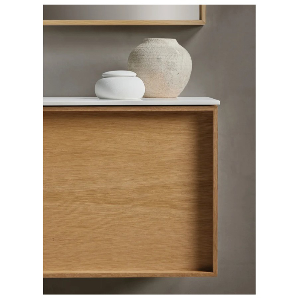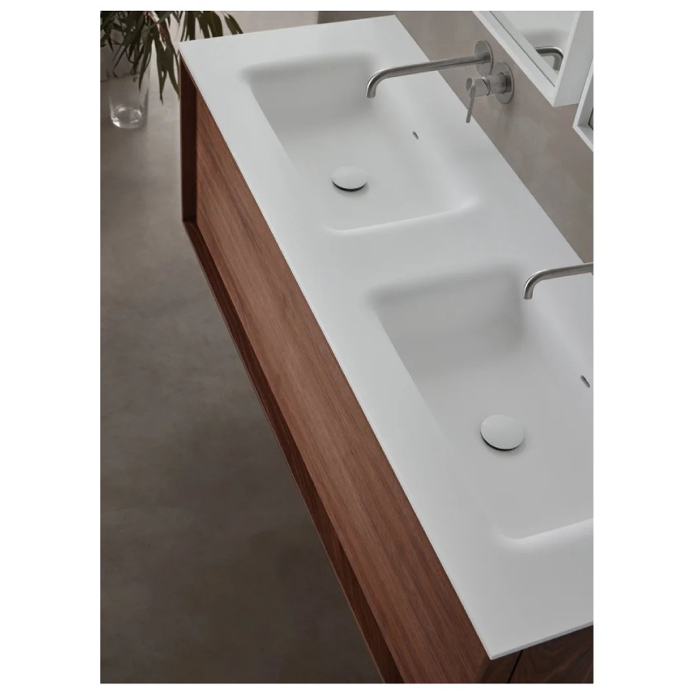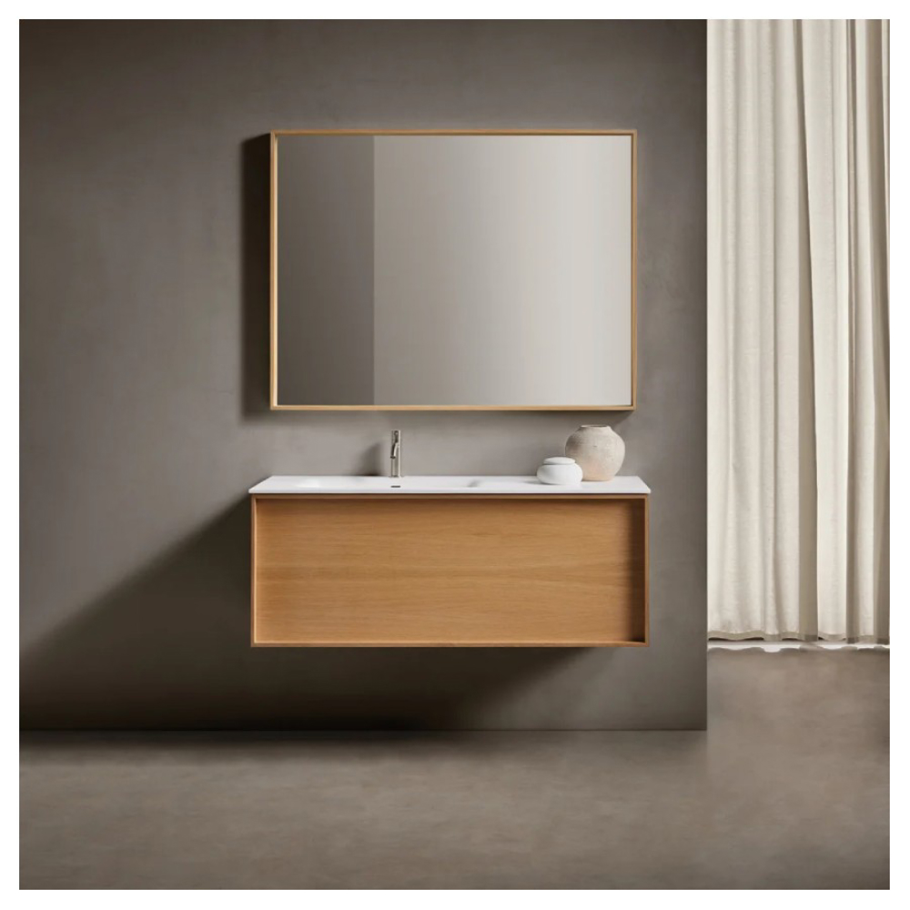 The Robbia bathroom cabinet is made of solid wood. This vanity unit is available in Walnut wood or American Oak wood. Natural wood veneer finishes are applied to the drawer front of the Robbia bathroom cabinet. Accompanied by the mirror from the same range, this vanity unit is suitable for a designer style bathroom.