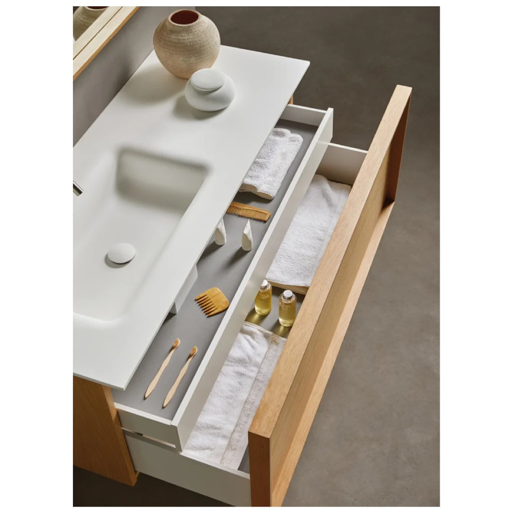 The Robbia natural wood bathroom cabinet has a large drawer as well as an English drawer. It has a height of 50 cm, a depth of 51 cm and a custom width ranging from 80 to 150 cm. This designer wooden bathroom sink unit offers generous storage space for toiletries and accessories.