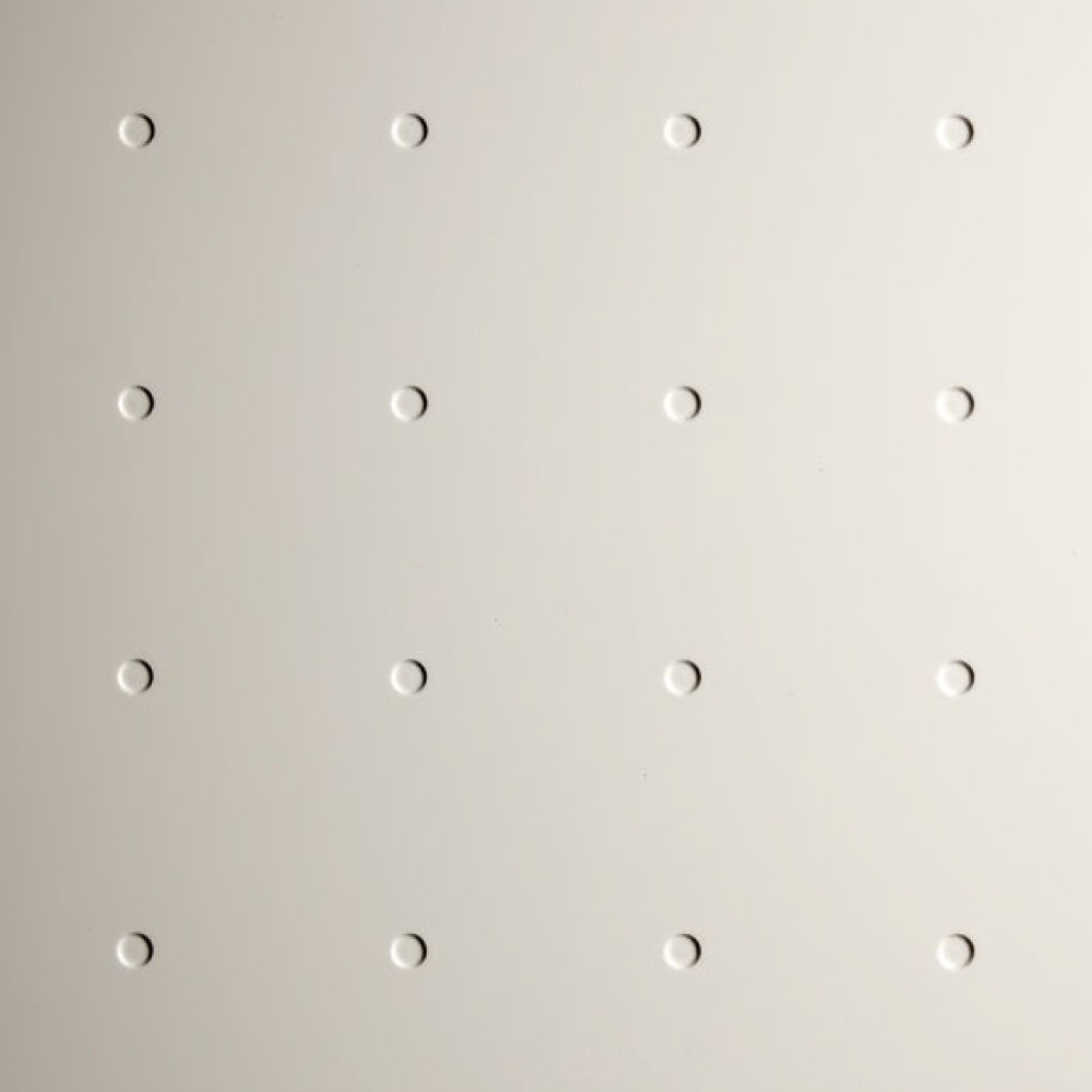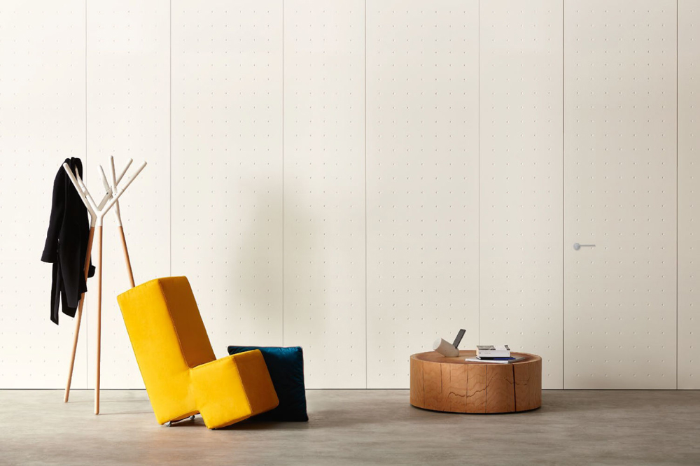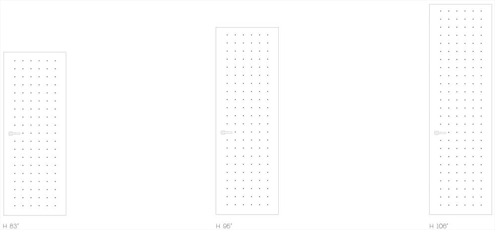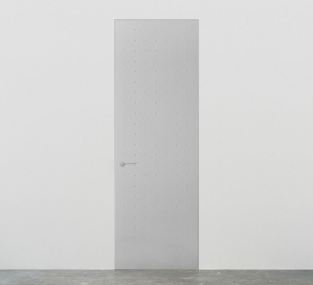 The constant and symmetrical rhythm of points defines the door by transforming it into a reference element that condenses the geometric tensions of the space in which it is located.