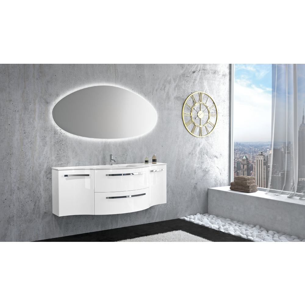 Yara all-mounted vanity in glossy black, white, red, grey, slate, or sand. This includes the vanity piece, which has two soft-closing drawers, along with the Tekorlux (composite) sink top. Also, a left concave cabinet and a right rounded cabinet, which has soft closing doors and one glass shelf each. Hardware is included. Optional legs are available (model number: OA-AM-LEGS).