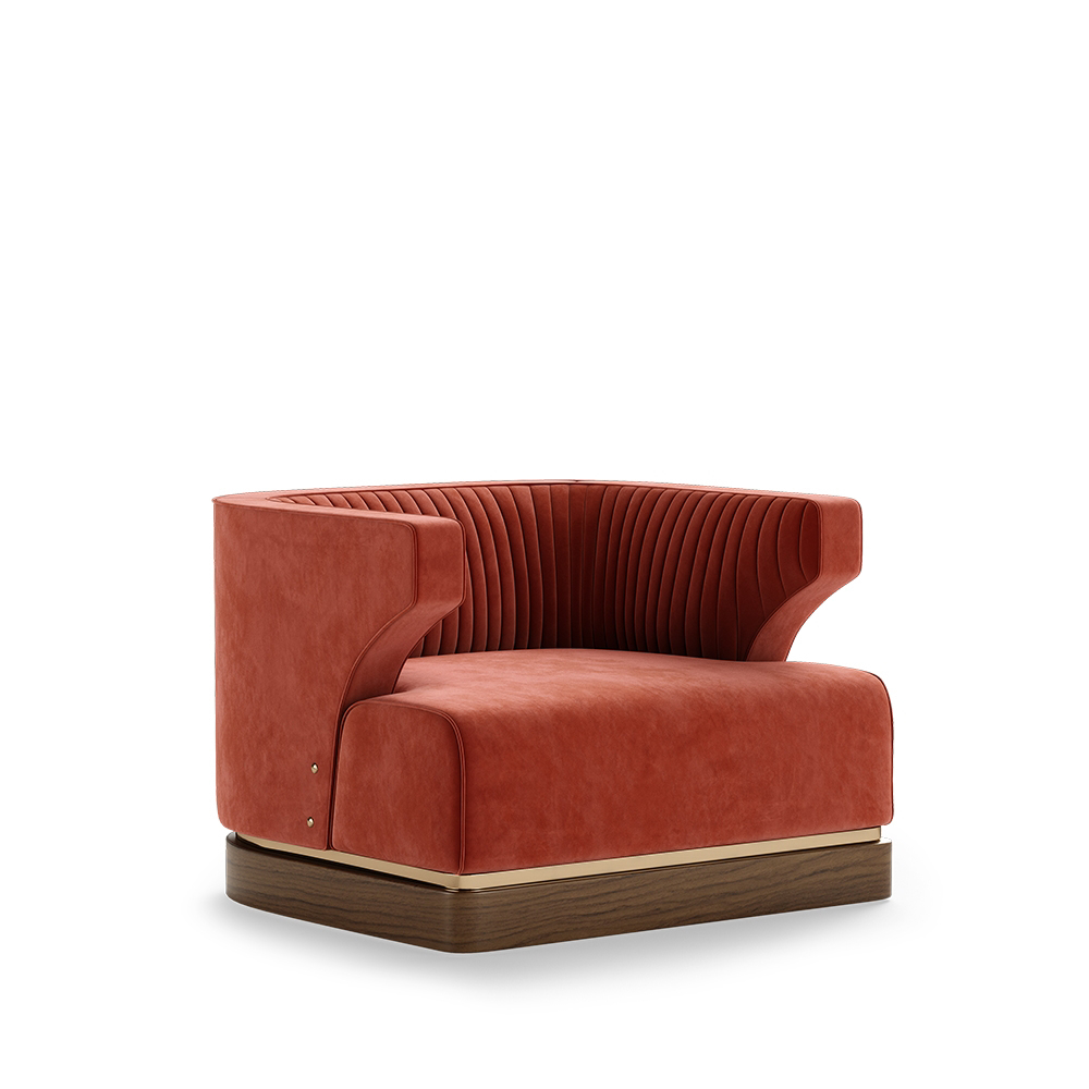 Inspired by the well-known American jazz saxophonist Gene Ammons, the Ammons armchair seeks to convey boldness and luxury through the polished brass details and the soft colorful fabric. It intends to give a fresh aura to any design, and its strong shape is what makes it so unique.