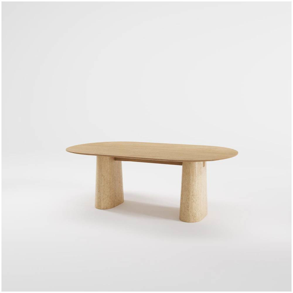 Anchor is a luxurious dining table available in three sizes, featuring a wood top supported by two rounded Travertine legs. Designed with a focus on stability and harmony, this piece embodies a sense of grounded elegance, where every line and proportion reflects a thoughtful interconnection between its elements.