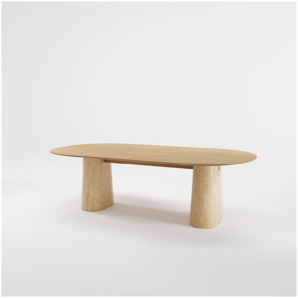Anchor is a luxurious dining table available in three sizes, featuring a wood top supported by two rounded Travertine legs. Designed with a focus on stability and harmony, this piece embodies a sense of grounded elegance, where every line and proportion reflects a thoughtful interconnection between its elements.