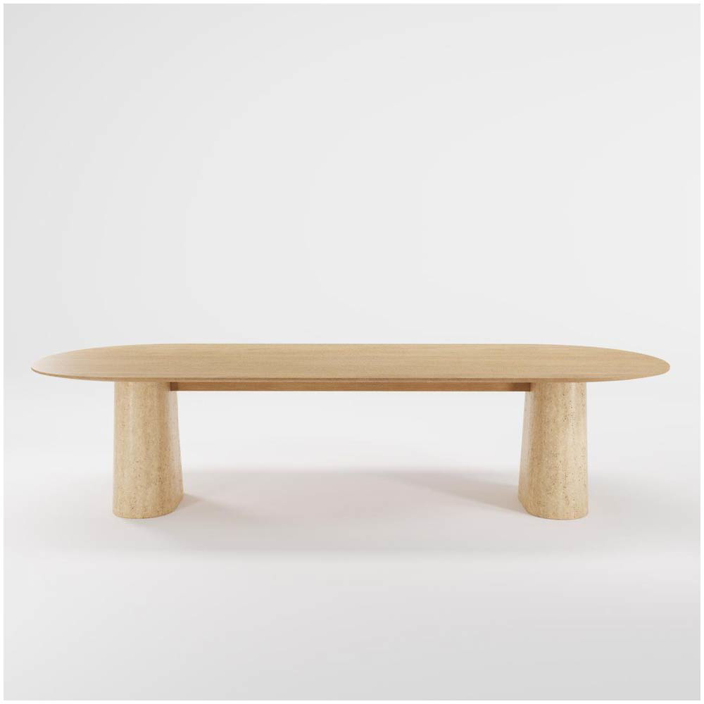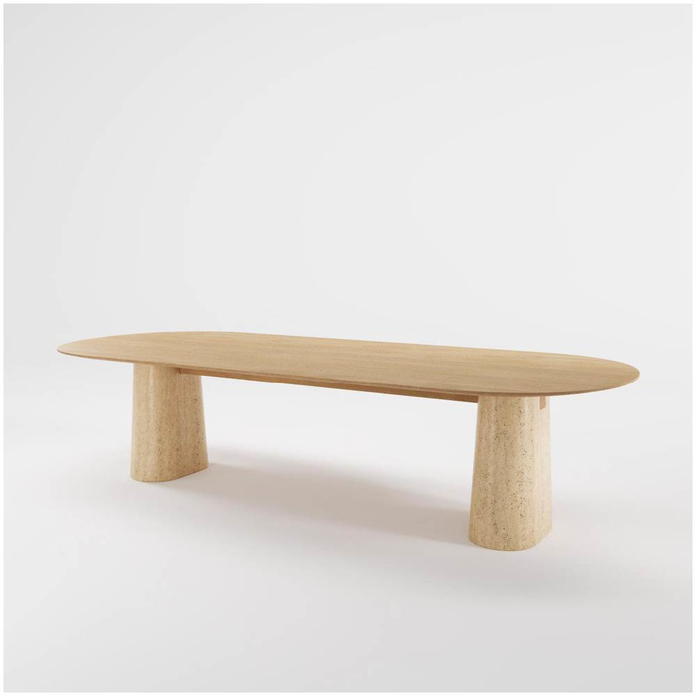 Anchor is a luxurious dining table available in three sizes, featuring a wood top supported by two rounded Travertine legs. Designed with a focus on stability and harmony, this piece embodies a sense of grounded elegance, where every line and proportion reflects a thoughtful interconnection between its elements.