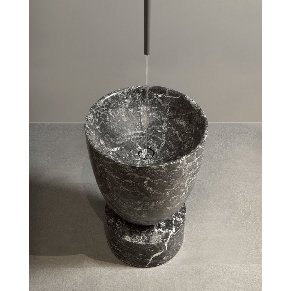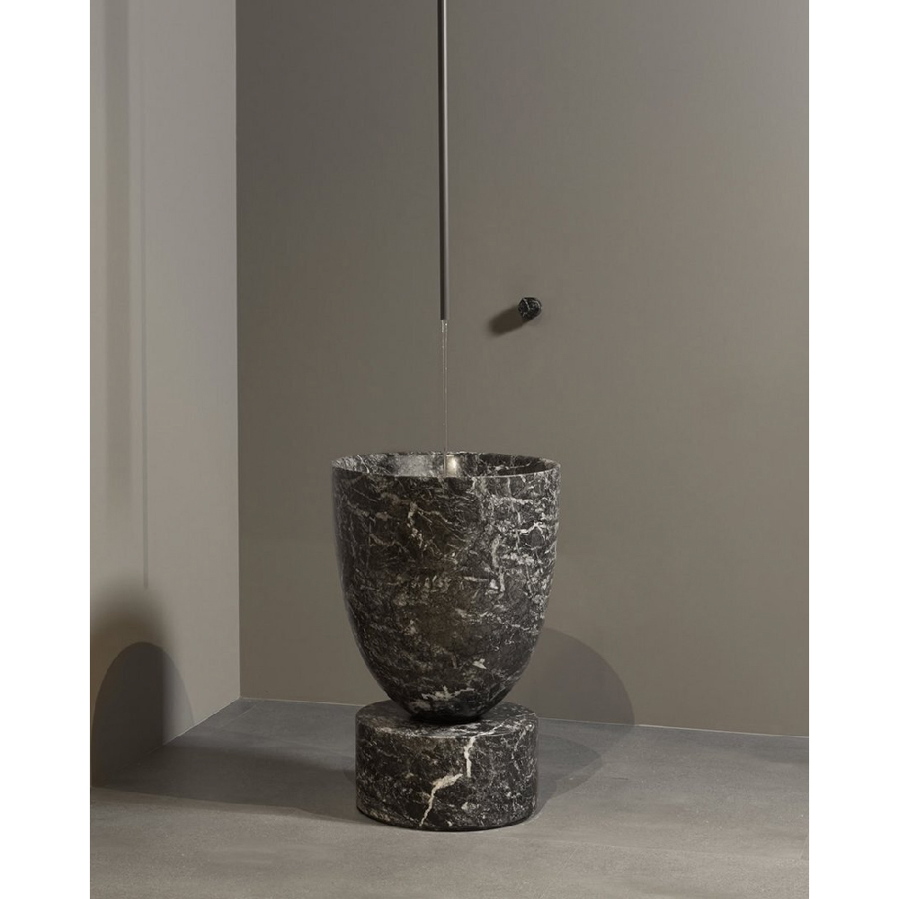 A sculpture in the round, a capacious, soft, rounded basin that is grafted onto a base just as in the classical image of a font. An important presence that defines the hierarchy of the bathroom environment, a center of gravity around which all the relationships between the elements and the people who inhabit this space will revolve. The charm of stone, the preciousness of marble, the water falling from above to slowly “excavate” the material. Arcadia is available in Bianco Carrara, Nero Marquinia, Stone Grey, Bardiglio Nuvolato, Verde Alpi and all marbles from the antoniolupi collection.
