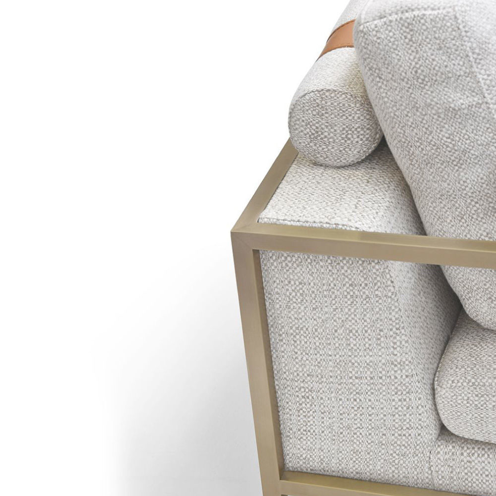 Seat and backrest in fabric Spiga col. 1, tone on tone stitching, roll cushions in fabric as above with leather Daino col. Whiskey inserts, structure in stainless steel Champagne finish, back panels in leather Daino col. Whiskey.