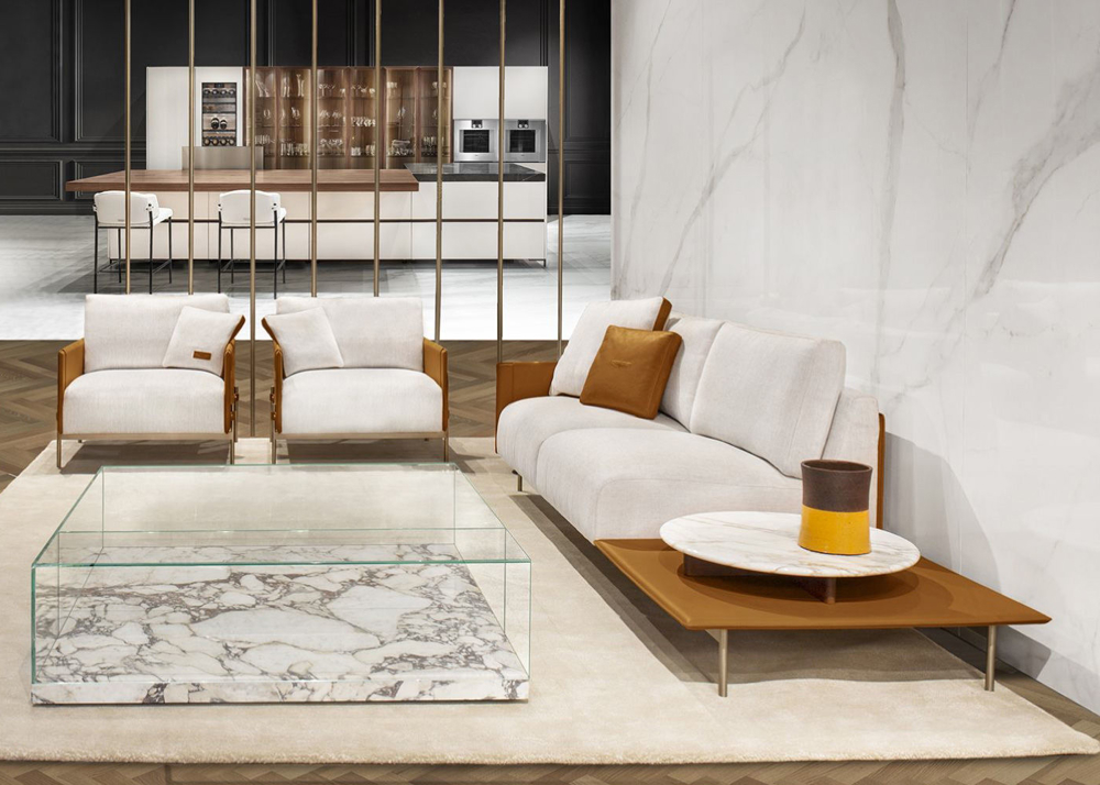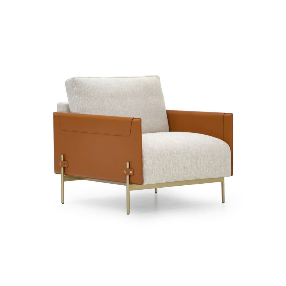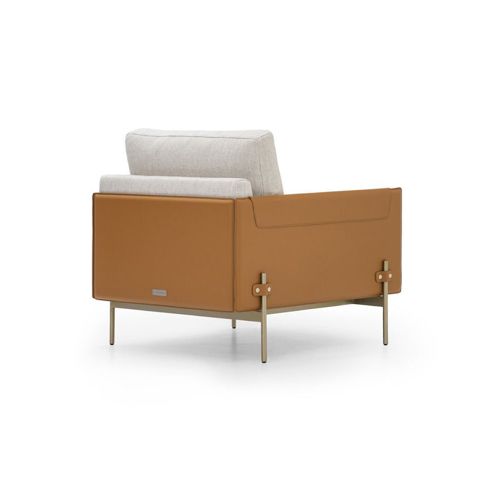 Structure & flaps in Cuoio leather col. Kestral Tan, cushions in fabric Brera col. 02, metal structure & metal buttons with AM logo in light gold finish.