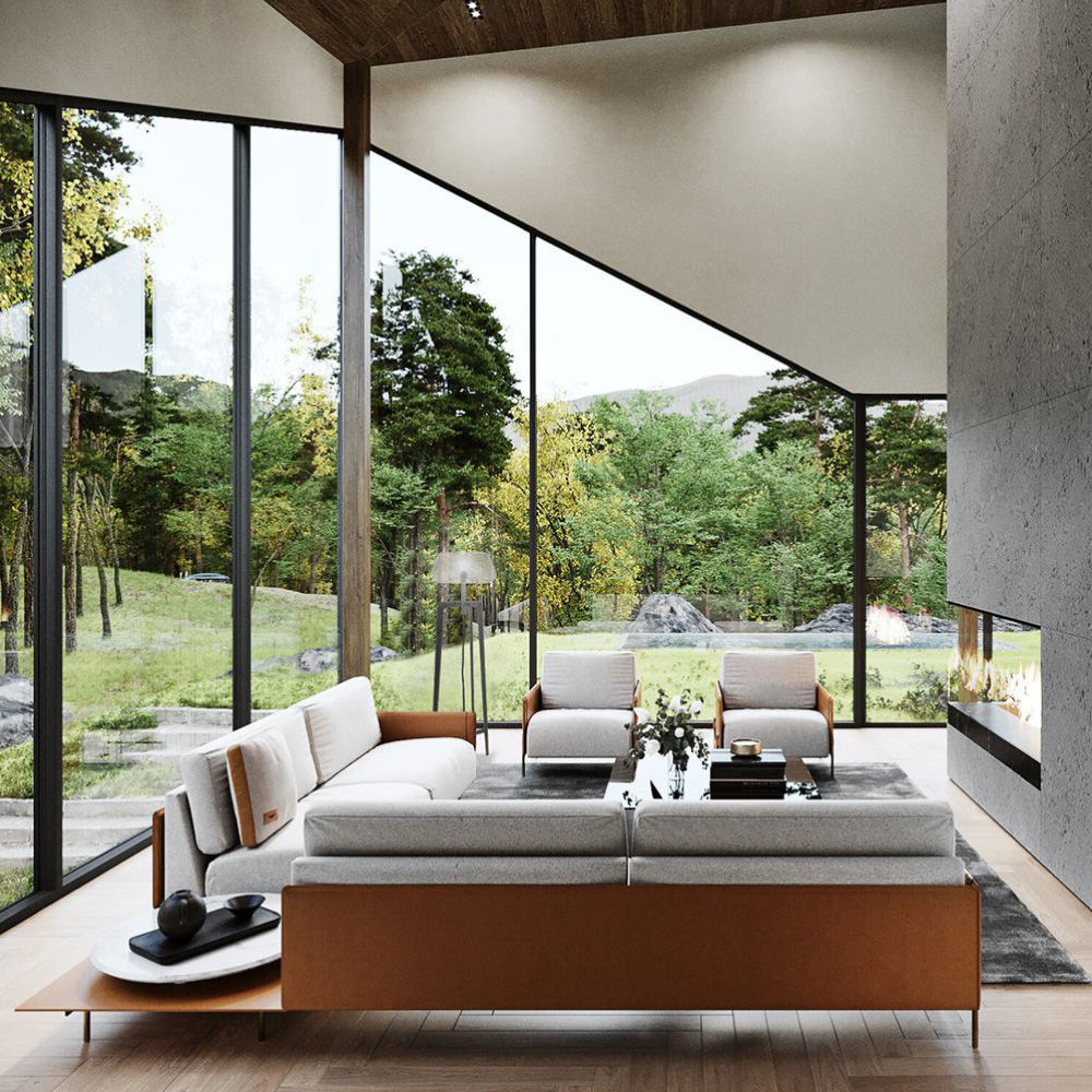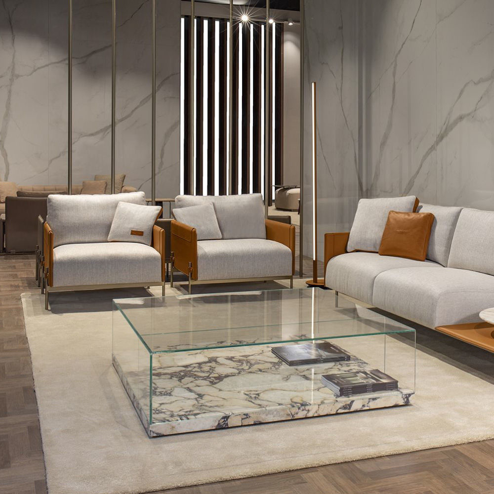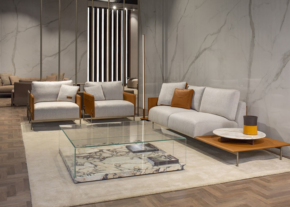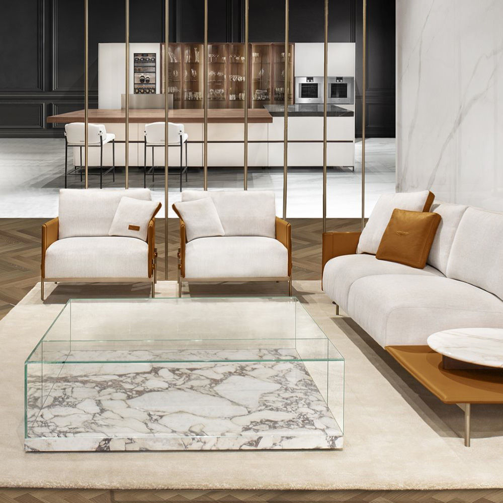 Structure & flaps in Cuoio leather col. Kestral Tan, cushions in fabric Brera col. 02, metal structure & metal buttons with AM logo in light gold finish.
