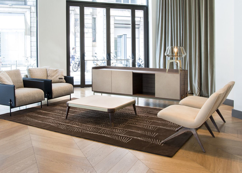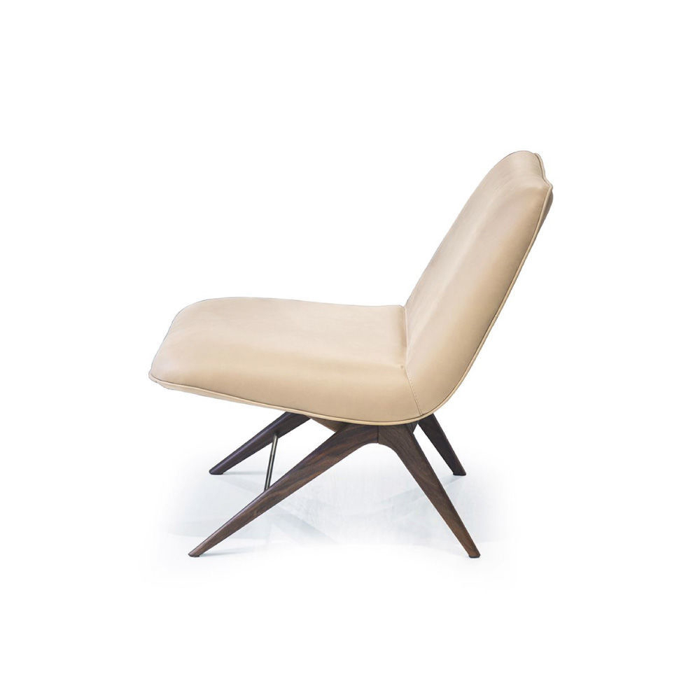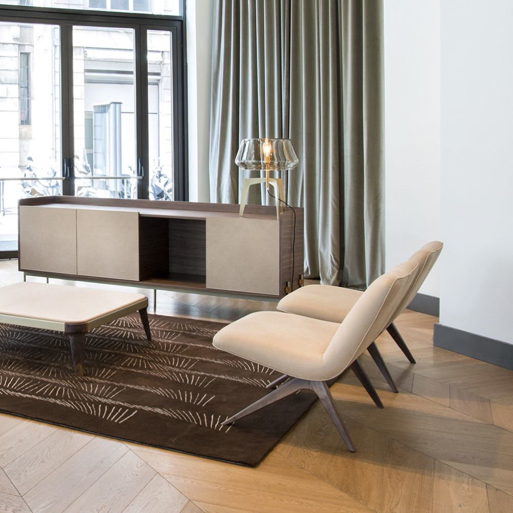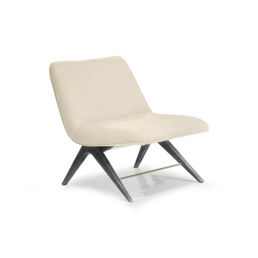 Leather Kobe col. 6210, tone on tone stitching, metal inserts Light Gold satin finish, legs in Ash hardwood col. black open pore finish.