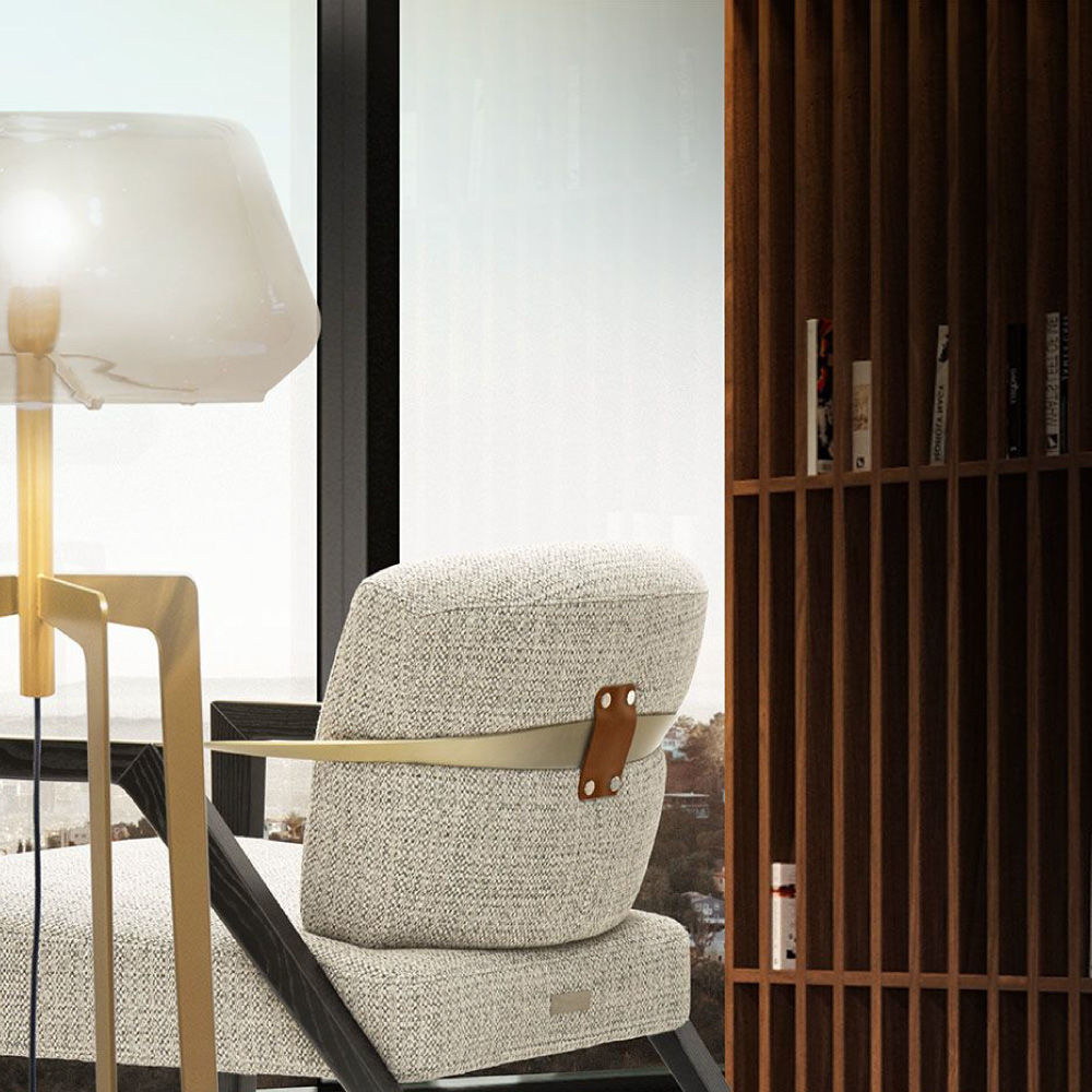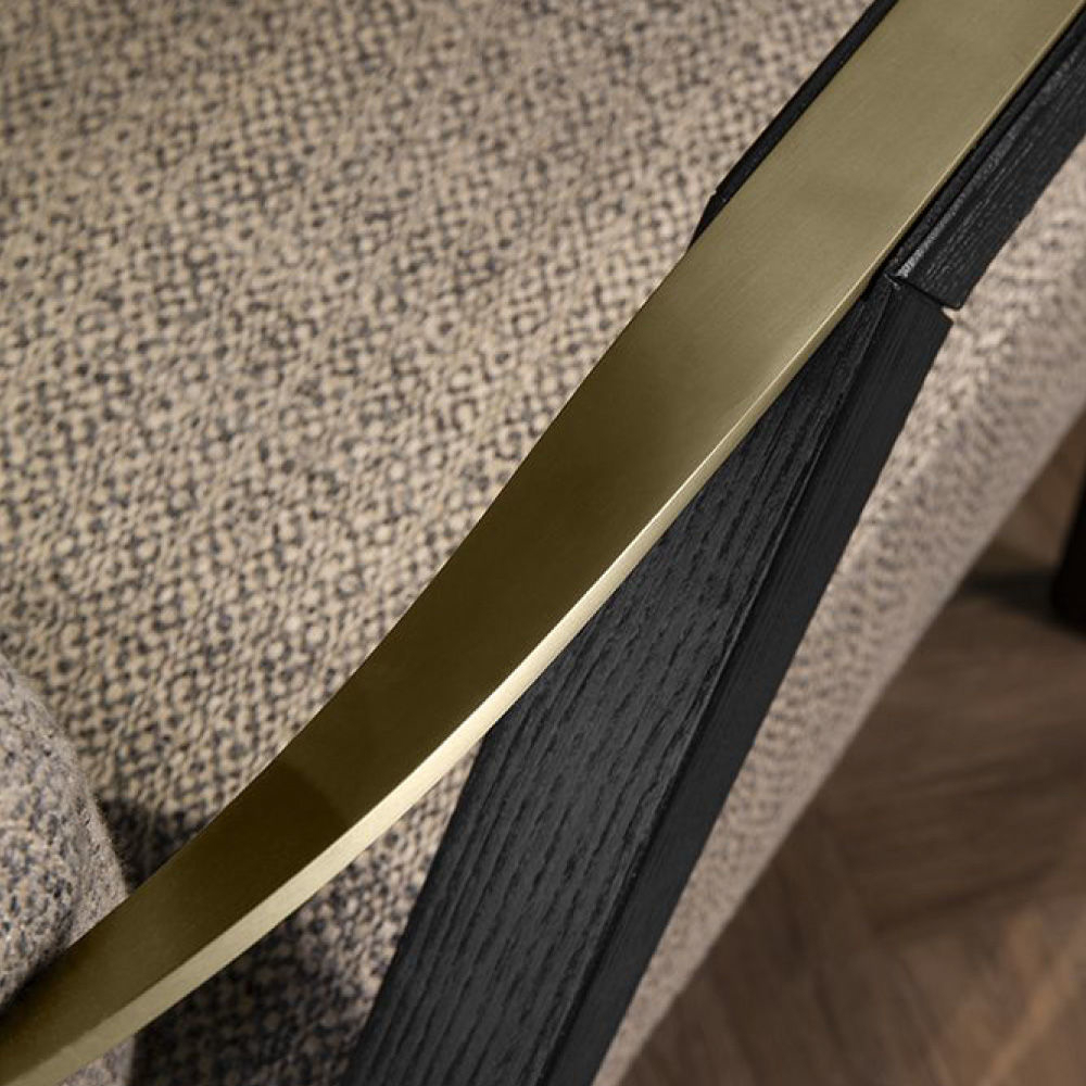 In fabric Spiga col. 09, metal band in light gold finish, legs in Ash solid wood lacquered col. black open pore, flap in Cuoio leather col. Pure Black, buttons with AM logo in light gold finish.