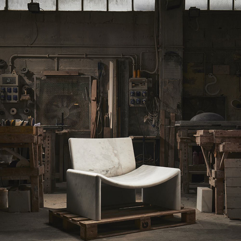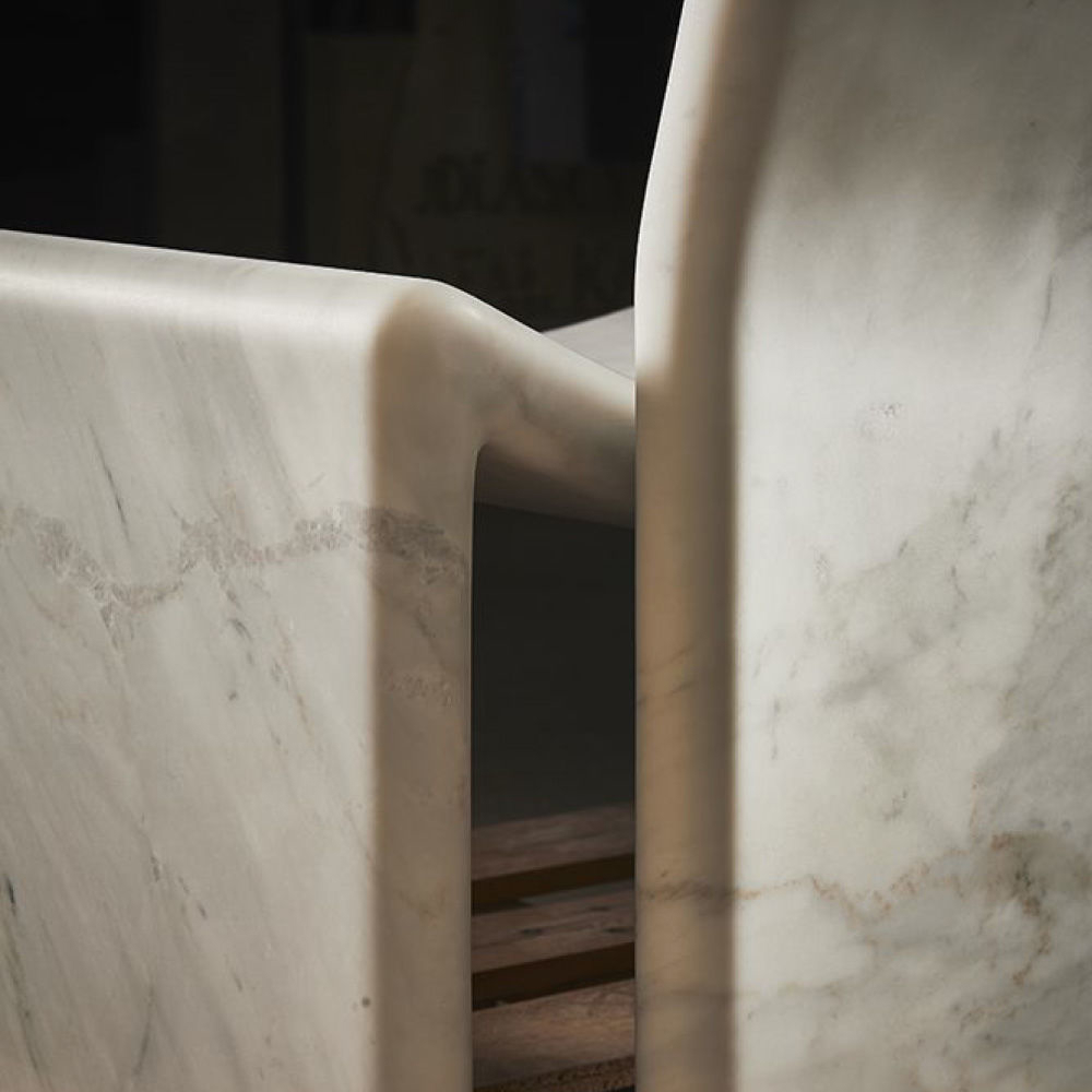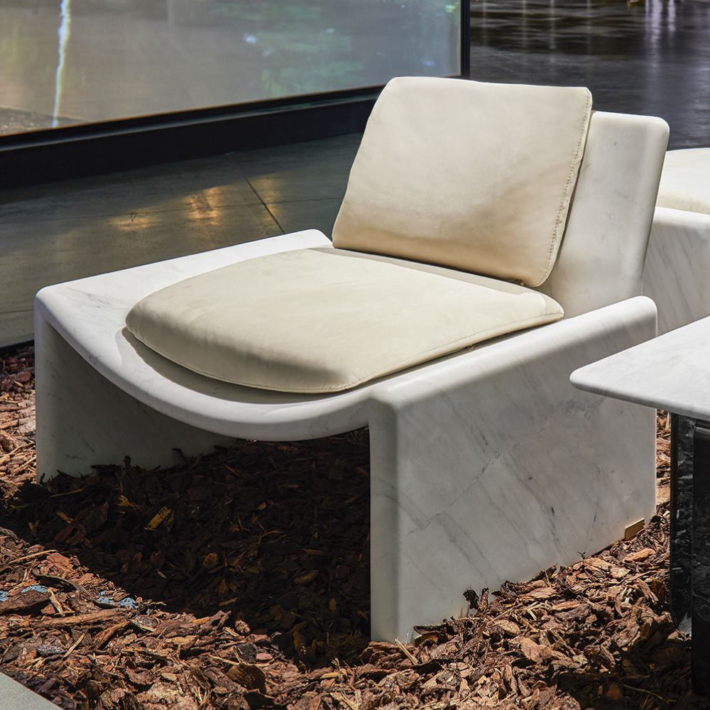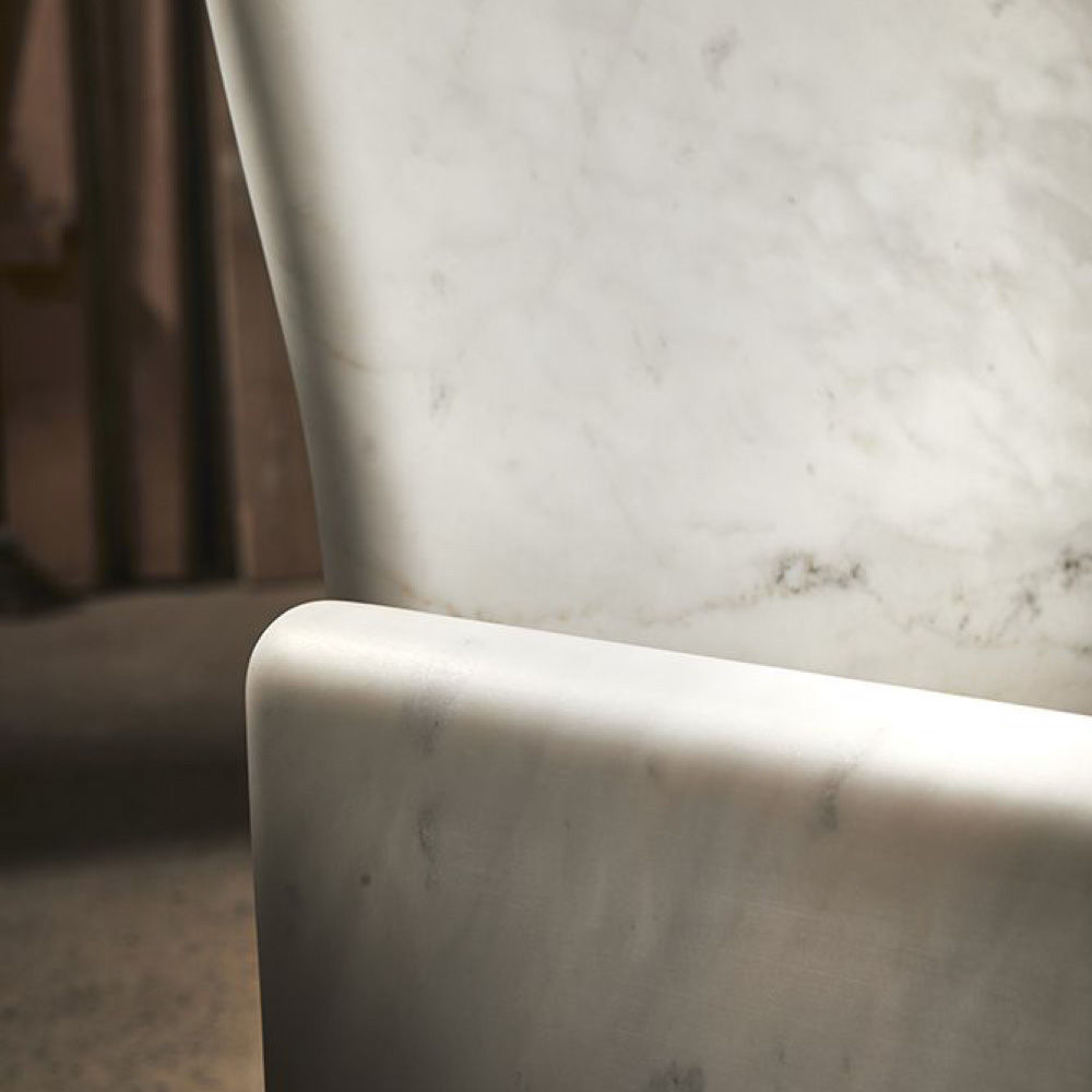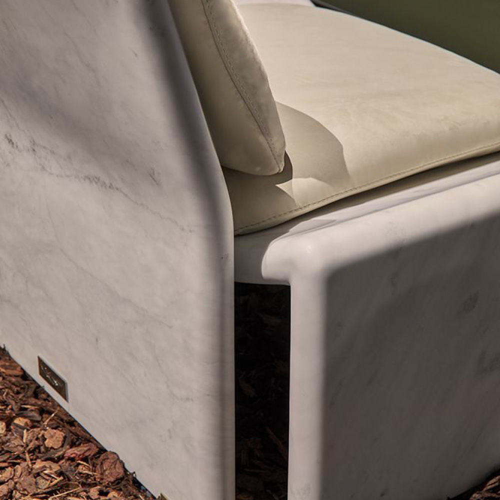 Structure in Carrara marble, seat and back cushions in leather Nabuk col. Powder, metal feet in light gold finish.