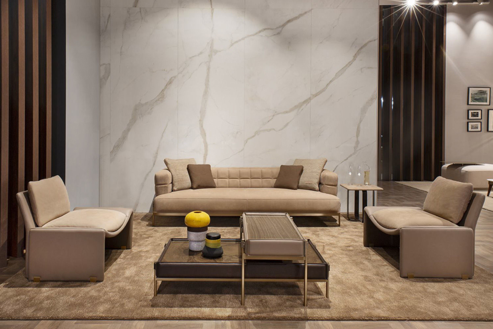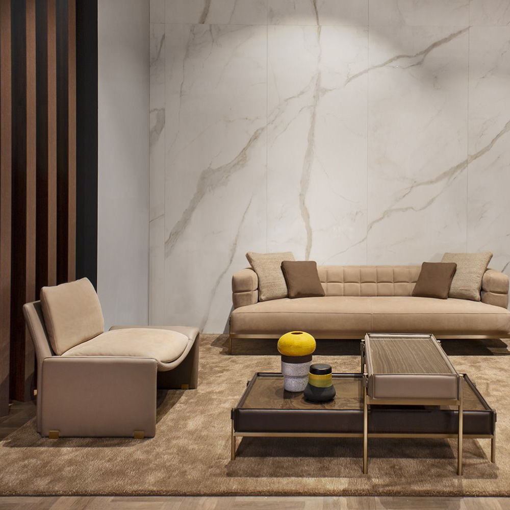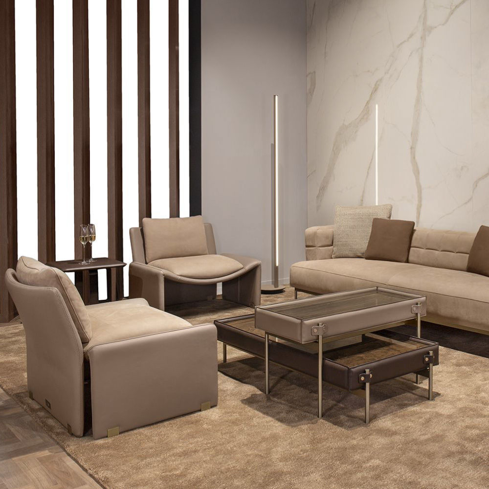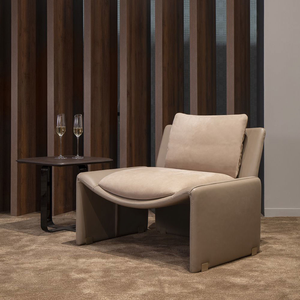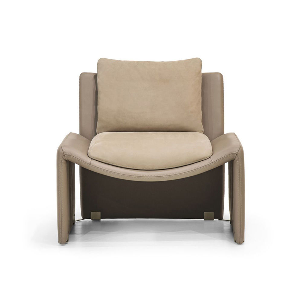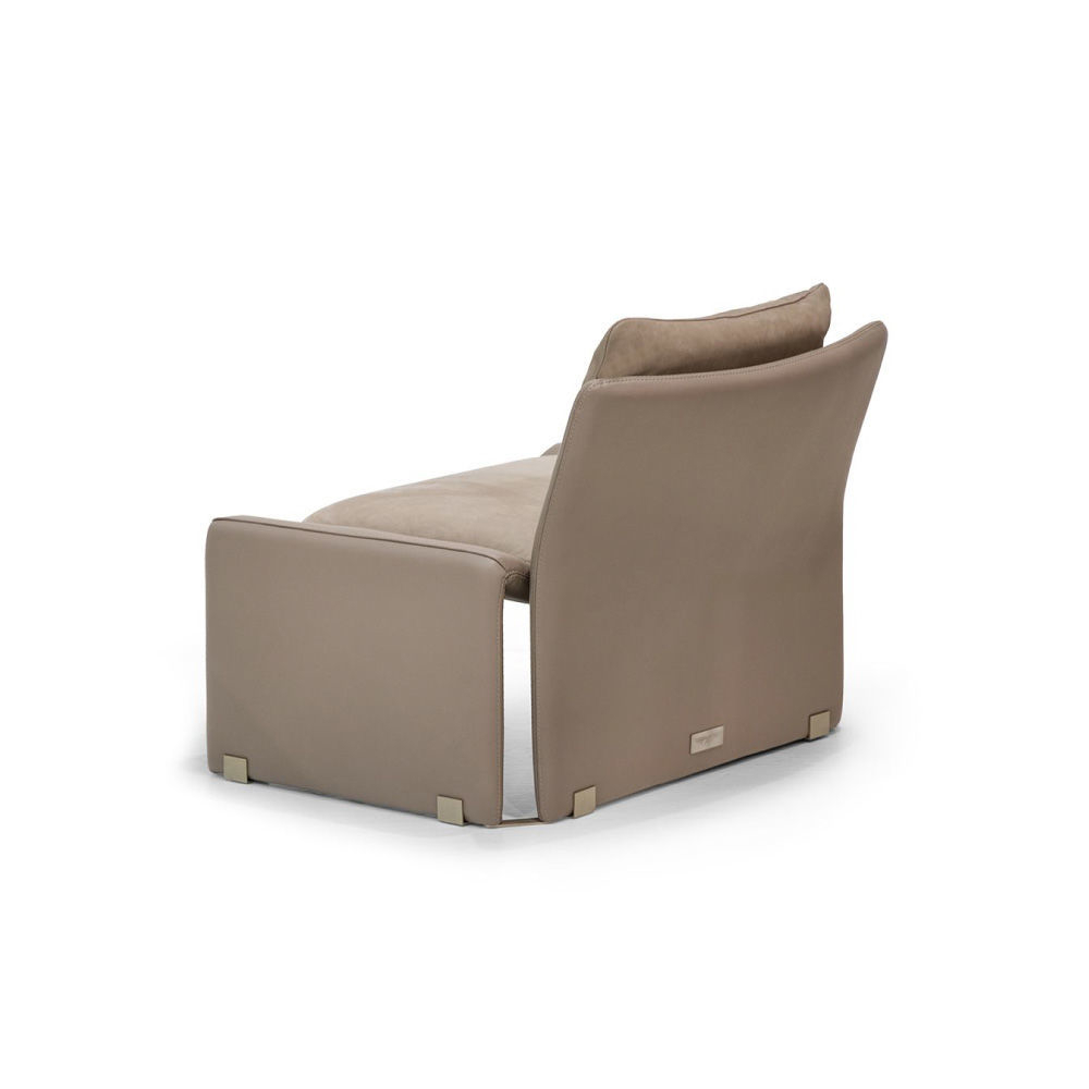 Structure in Cuoio leather col. Taupe, seat and back cushions in leather Nabuk col. Powder, metal feet in light gold finish.