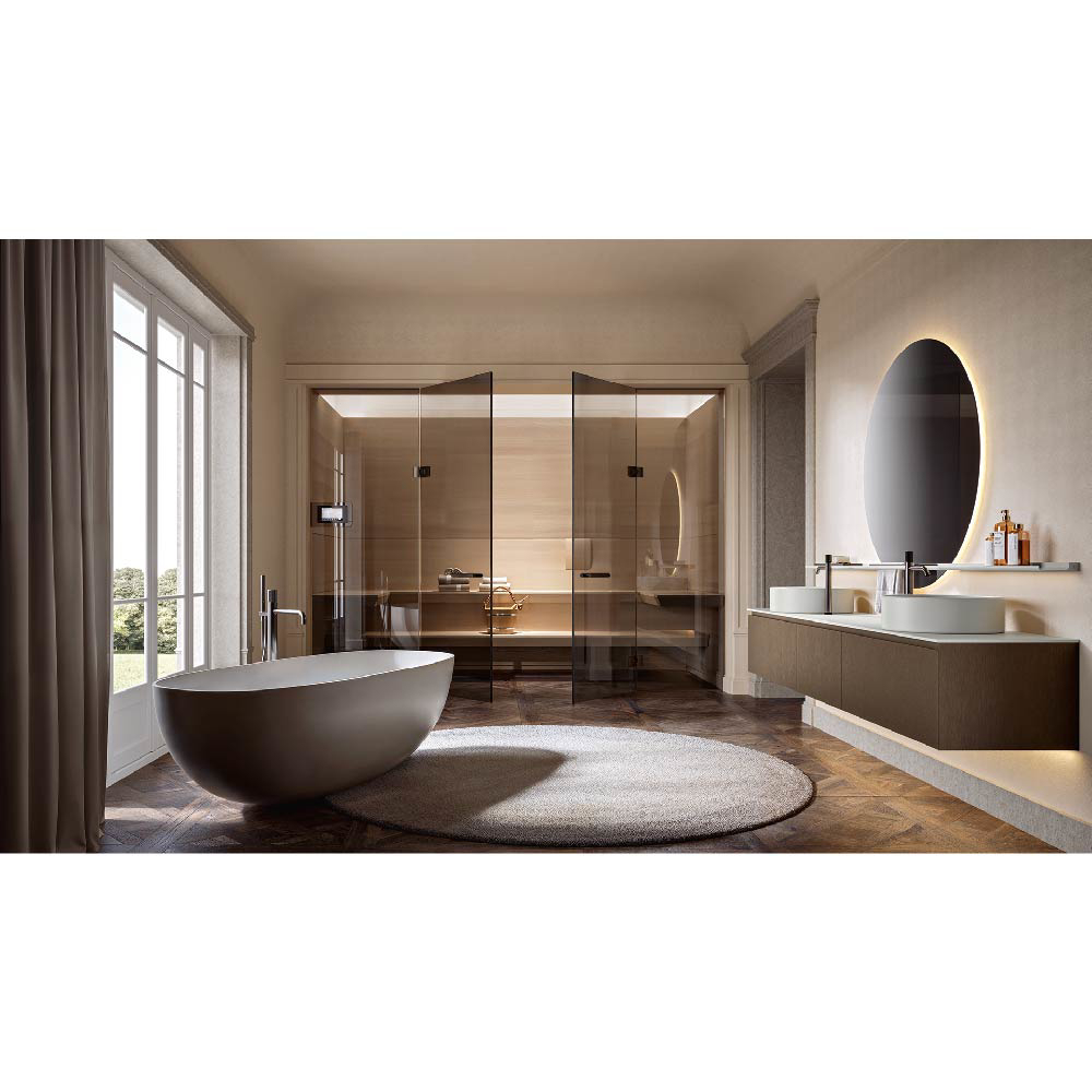 Designed on elegant 45° side panel joints, ARTEMIDE lends itself with great versatility to express very different styles. An element of continuity is the counter top which, in any interpretation of this model, delineates the relationship between storage unit and washbasin space. The handle sockets are obtained with another 45° cut and, in the case of a double drawer solution, create a distinctive central groove.