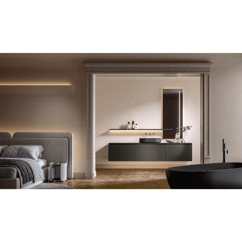Designed on elegant 45° side panel joints, ARTEMIDE lends itself with great versatility to express very different styles. An element of continuity is the counter top which, in any interpretation of this model, delineates the relationship between storage unit and washbasin space. The handle sockets are obtained with another 45° cut and, in the case of a double drawer solution, create a distinctive central groove.