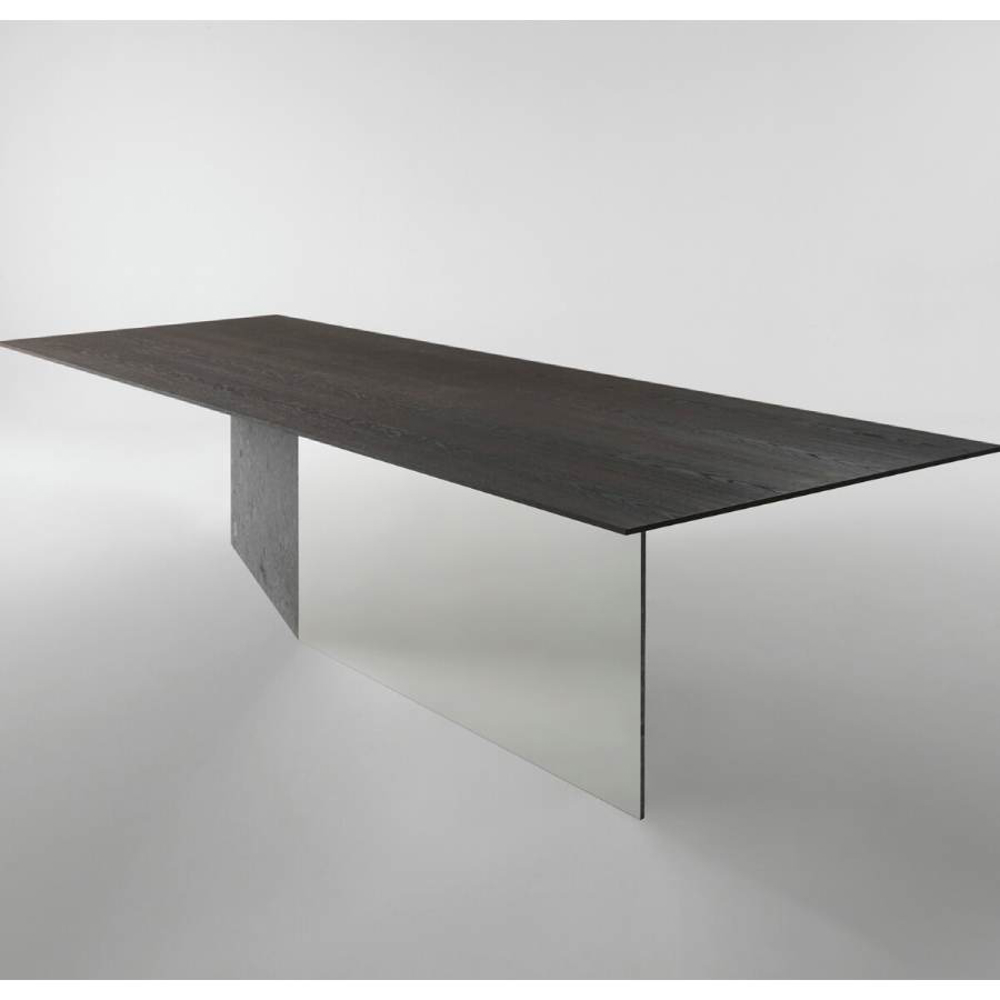 An essential balance of lines and volumes determines the elegant composition which juxtaposes a sculptural foot and a top with slender proportions obtained by tapering the thickness of the perimeter to the extreme.