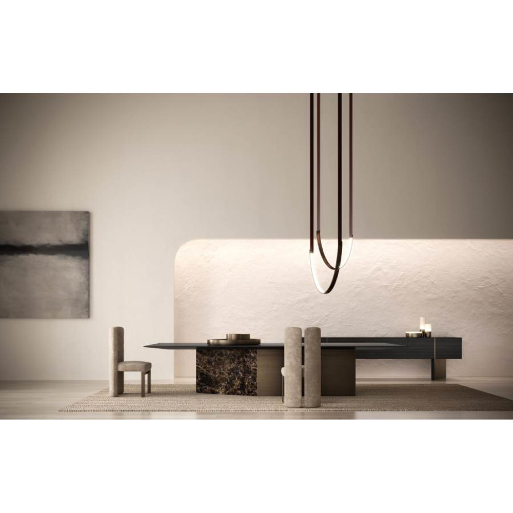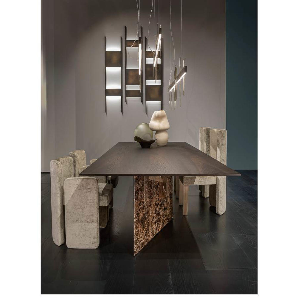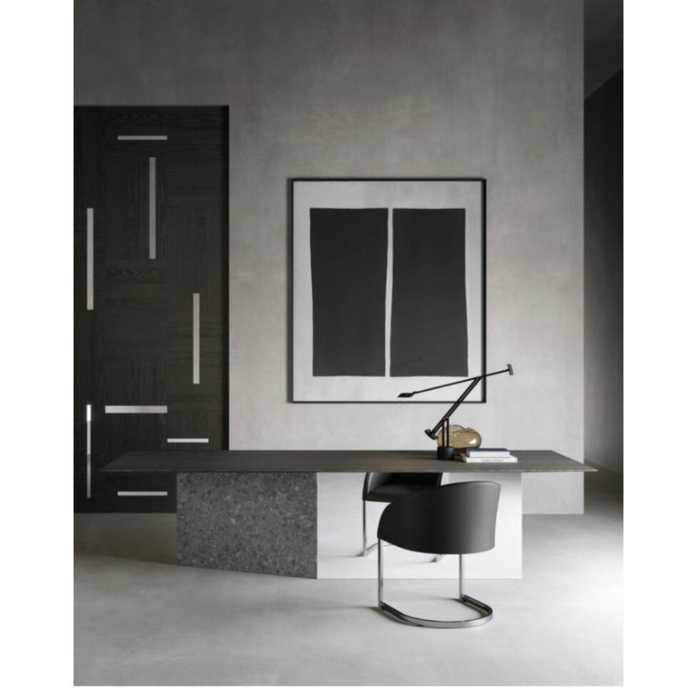 An essential balance of lines and volumes determines the elegant composition which juxtaposes a sculptural foot and a top with slender proportions obtained by tapering the thickness of the perimeter to the extreme.