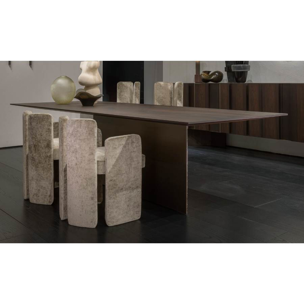 An essential balance of lines and volumes determines the elegant composition which juxtaposes a sculptural foot and a top with slender proportions obtained by tapering the thickness of the perimeter to the extreme.