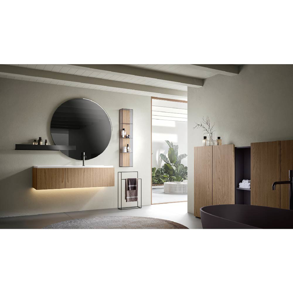 As integral part of the top, the sink embraces and deepens the concept of rounded lines and rich volumes sought in the Atena top. The spacious basin appears to be carved, layer by layer, as if from a solid block. The strategically designed joints also allow, with a very simple design gesture, the transition from a single vanity—ideal for smaller bathrooms—to a striking multi-sink installation.