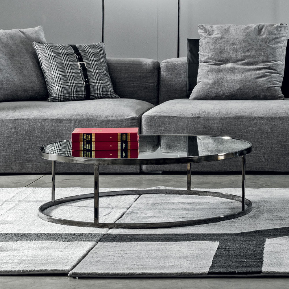 A family of coffee tables with a round, square or rectangular base. The frame and the top give it the strongest touch of personality and character. Chrome or satin the first; mirror, antique mirror, marble or saddle the second. Interesting also the role of negative space creating geometric interplays at the height of the legs with the possibility to overlay more tables making the lower ones disappear!