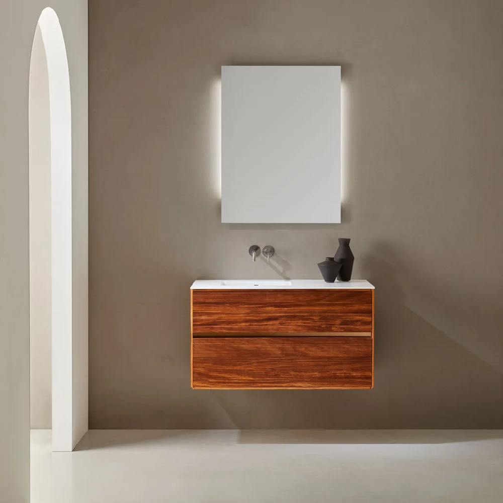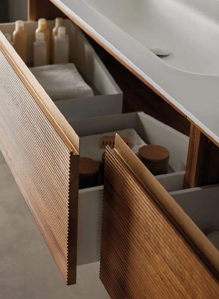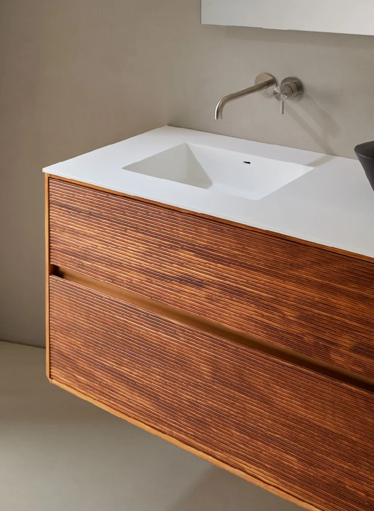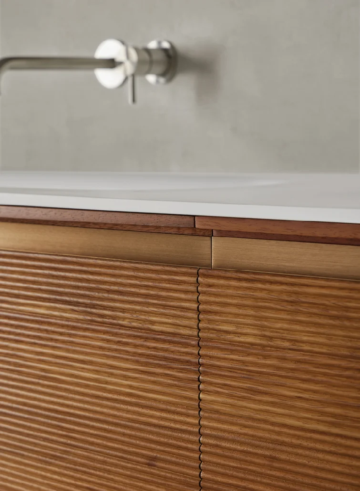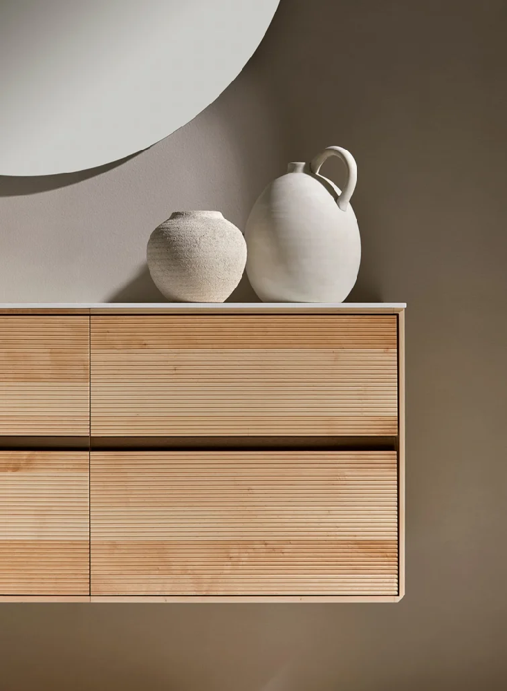 Bacall is inspired by the American Art Deco of the late 1930s. It arises from the passion for the classic cinema, which reflects a sophisticated and genuine style in its elegant and eclectic environments. With these images in mind, we were looking for a vanity that combined materials, textures and shapes, in a balanced and simple way. It brought us back to the American spirit of the 1930s. For this, we needed all our carpentry skills. We were able to recover interesting details in the joints, combine fronts with curves, edges that end obliquely in the frame that surrounds the vanity… and at the same time incorporate discreet touches of brass, which was so largely used at that time. For its creation, we selected solid wood protected by a colorless water-based varnish, to be as respectful as possible of the environment and the materials used. This transparent varnish allows you to see the wood in its natural state, with its veins, its knots, its nuances… The drawers have a pull opening, with semi-concealed brass-colored handles. In order to adapt to the needs of each project, the vanity is made to order, with different modular options.