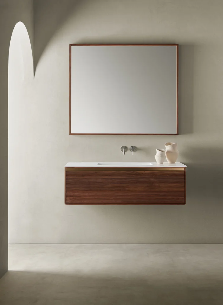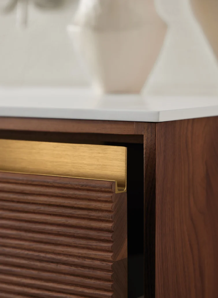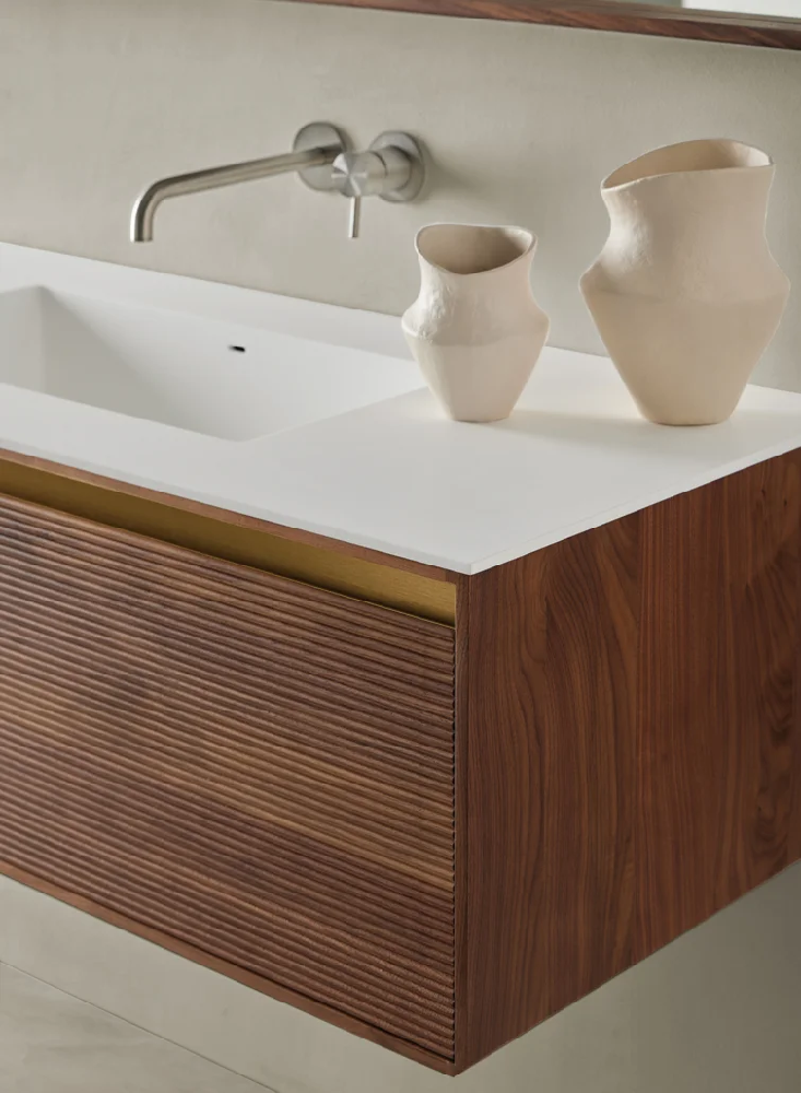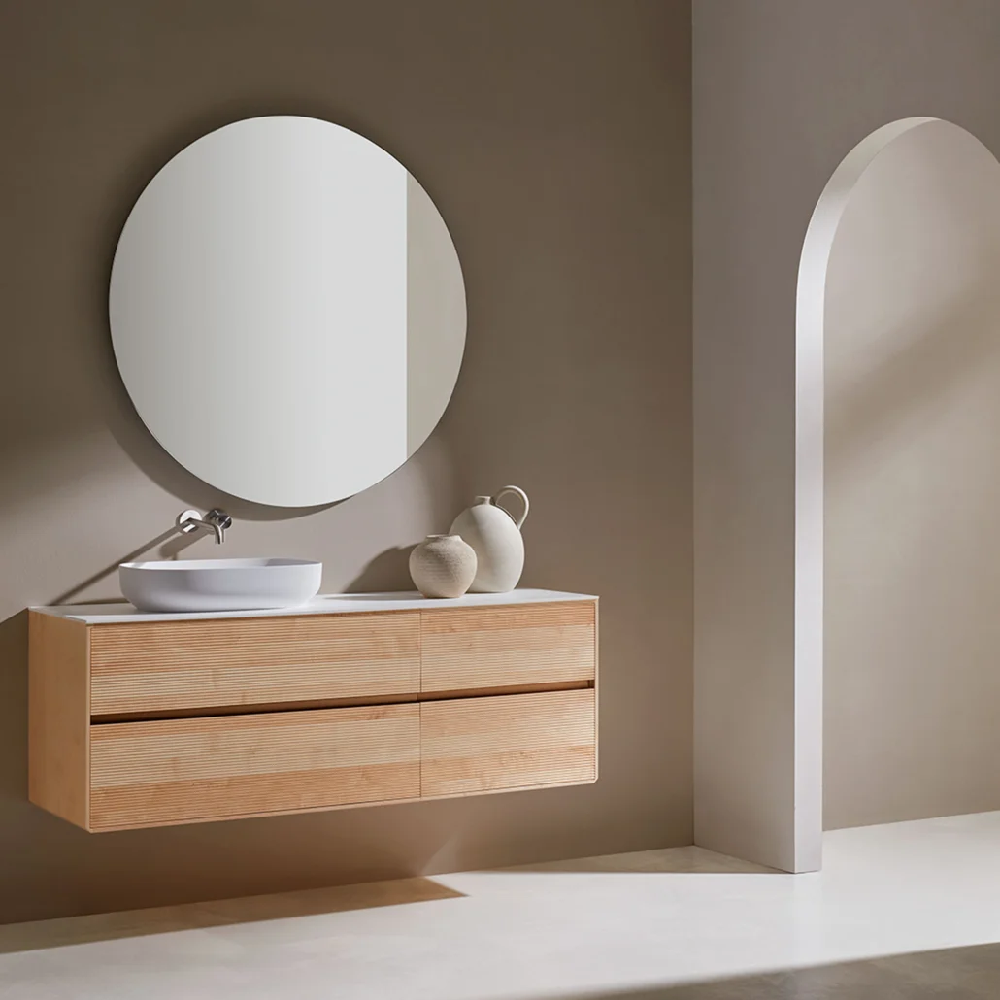 Bacall is inspired by the American Art Deco of the late 1930s. It arises from the passion for the classic cinema, which reflects a sophisticated and genuine style in its elegant and eclectic environments. With these images in mind, we were looking for a vanity that combined materials, textures and shapes, in a balanced and simple way. It brought us back to the American spirit of the 1930s. For this, we needed all our carpentry skills. We were able to recover interesting details in the joints, combine fronts with curves, edges that end obliquely in the frame that surrounds the vanity… and at the same time incorporate discreet touches of brass, which was so largely used at that time. For its creation, we selected solid wood protected by a colorless water-based varnish, to be as respectful as possible of the environment and the materials used. This transparent varnish allows you to see the wood in its natural state, with its veins, its knots, its nuances… The drawers have a pull opening, with semi-concealed brass-colored handles. In order to adapt to the needs of each project, the vanity is made to order, with different modular options.