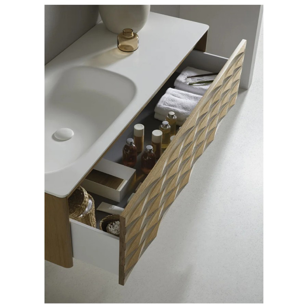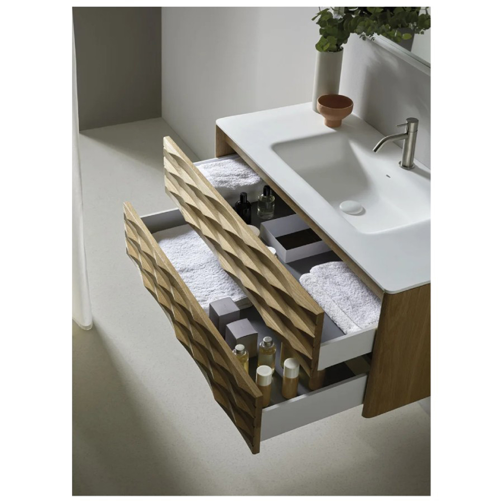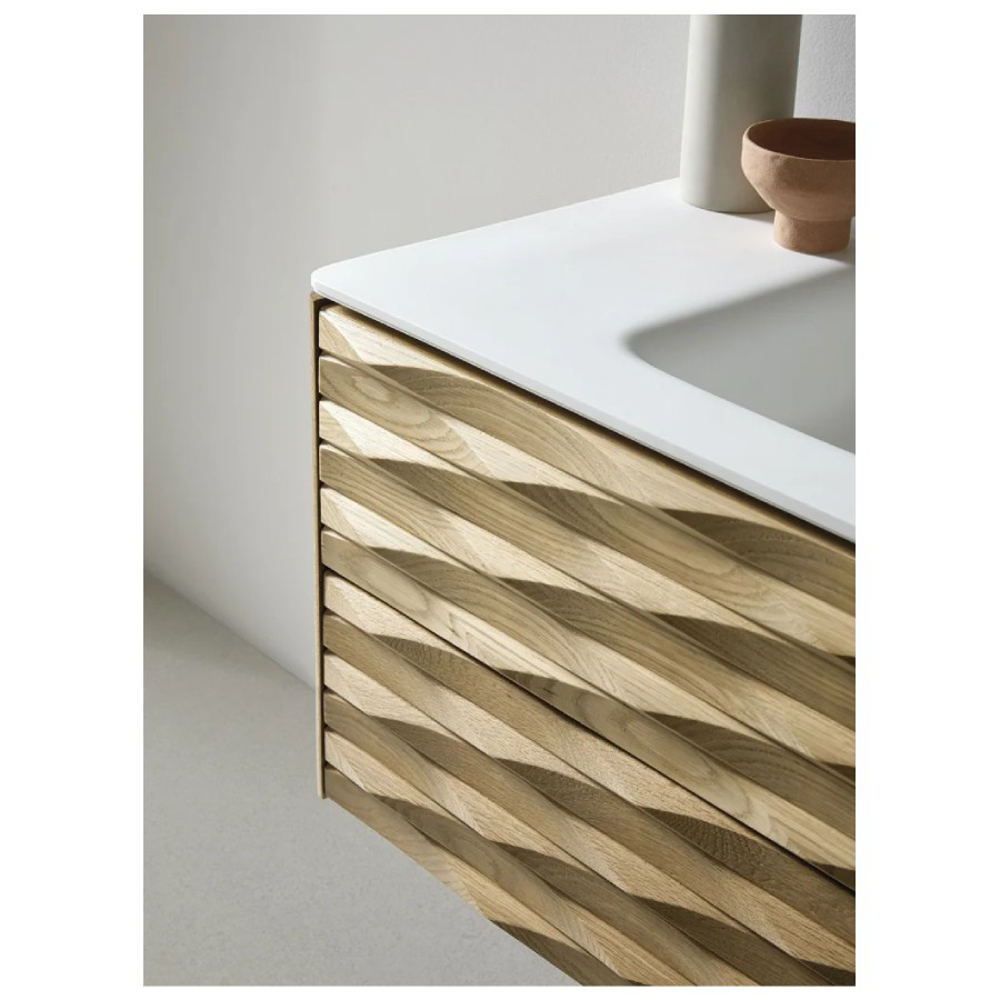 The structure of the Calla bathroom furniture is made of American Oak wood. The carved finish of the drawer fronts highlights the wood. Combined with a white ceramic vanity top, this solid wood vanity unit is suitable for a contemporary style bathroom.