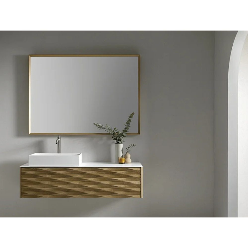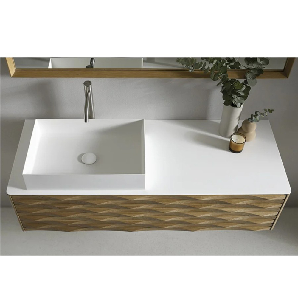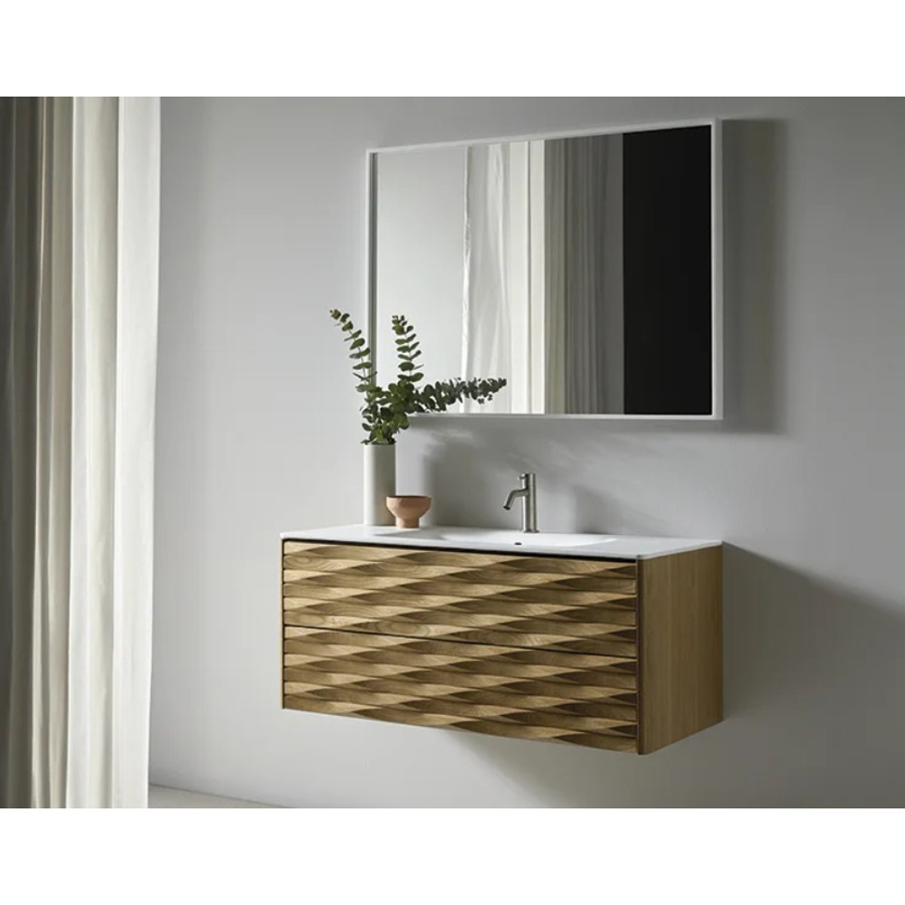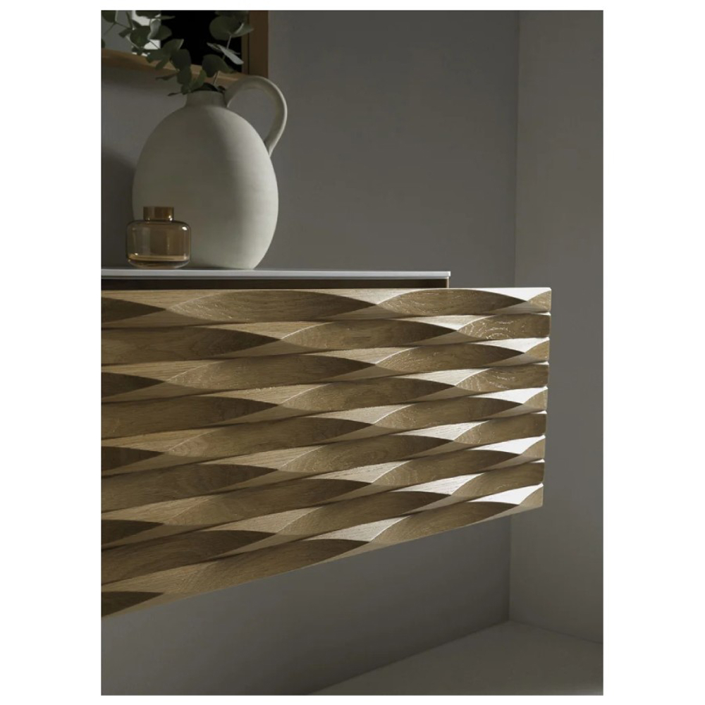 The structure of the Calla bathroom furniture is made of American Oak wood. The carved finish of the drawer fronts highlights the wood. Combined with a white ceramic vanity top, this solid wood vanity unit is suitable for a contemporary style bathroom.