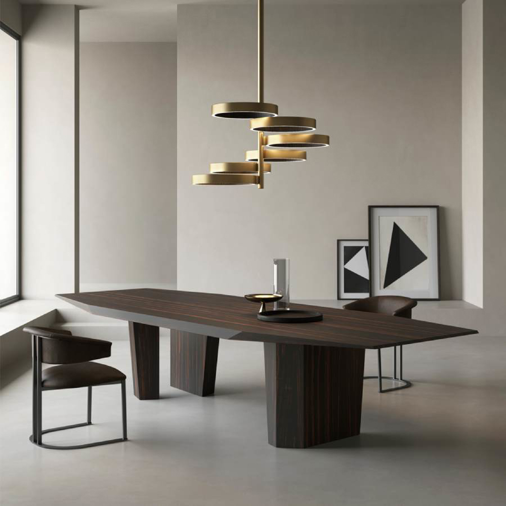Timeless shapes, with dynamic facets, for the series of tables made entirely of wood.