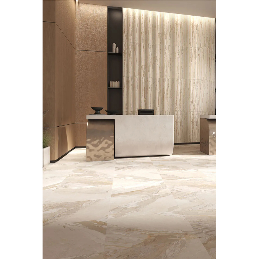 Perfect for modern, elegant, or minimalist spaces, Almond porcelain stoneware enhances floors and walls with its warm, natural glow.