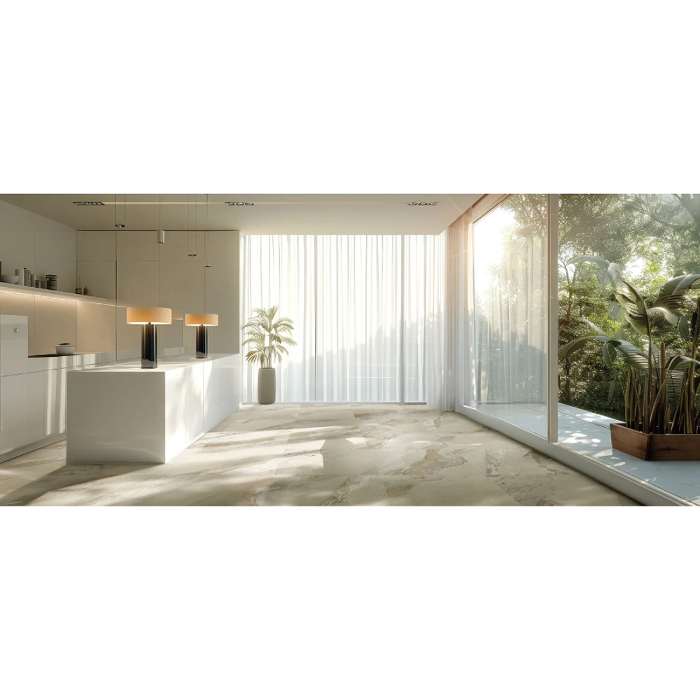 Perfect for modern, elegant, or minimalist spaces, Almond porcelain stoneware enhances floors and walls with its warm, natural glow.