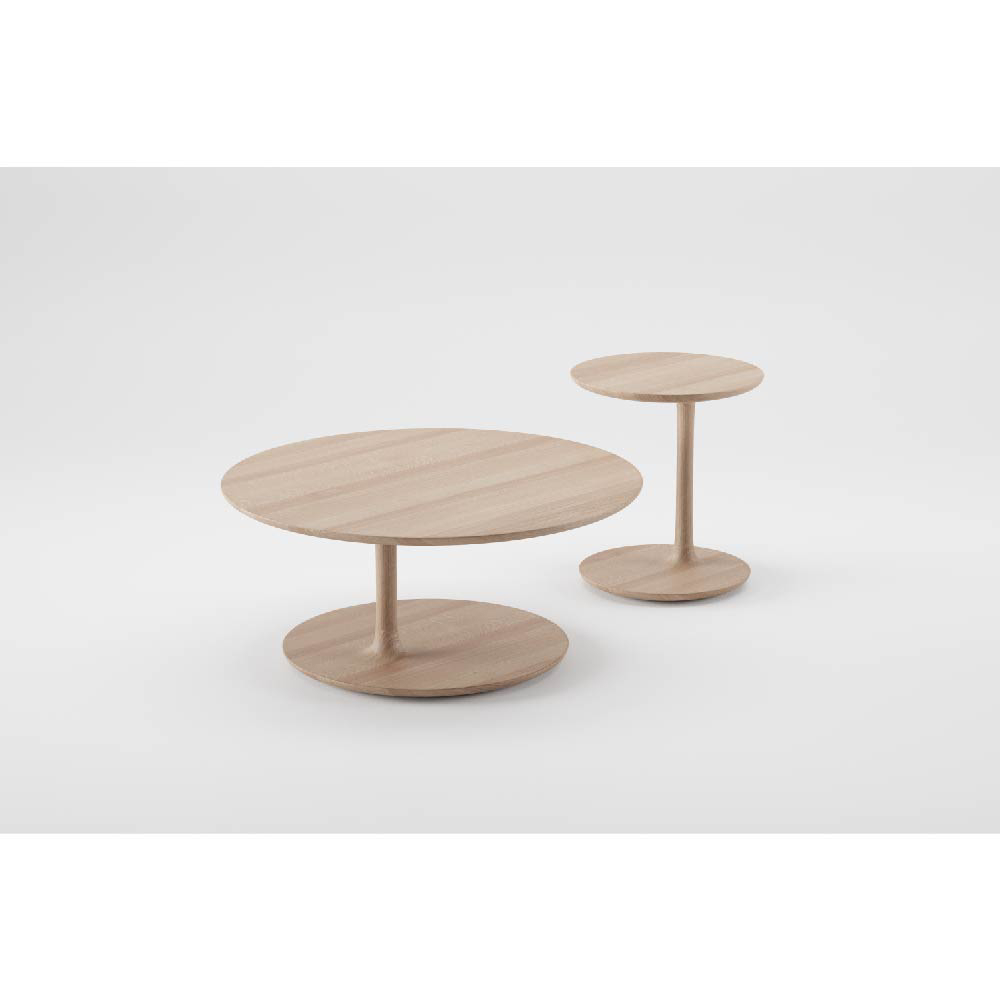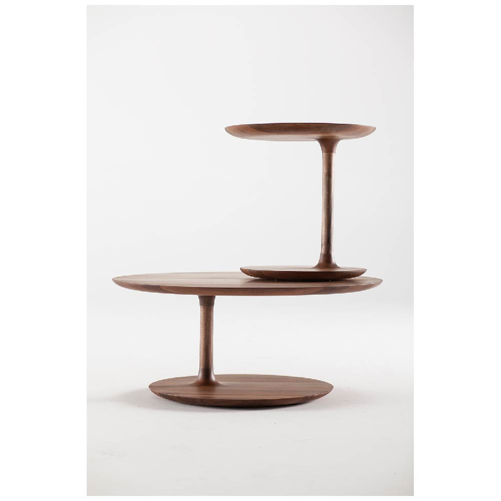 The tables vary in height and size, allowing for versatile combinations. Crafted from sustainably sourced solid wood the seamless transitions between elements evoke organic beauty and natural symmetry.